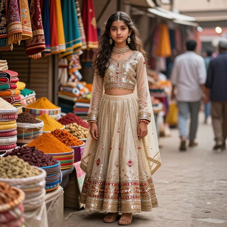 A Pakistani girl standing in a vibrant market in Lahore, wearing traditional ghungroo footwear and a sequined lehenga, surrounded by colorful fabrics and spices, with AI-generated realistic details and warm natural lighting, cinematic composition, high detail, ultra-realistic style.