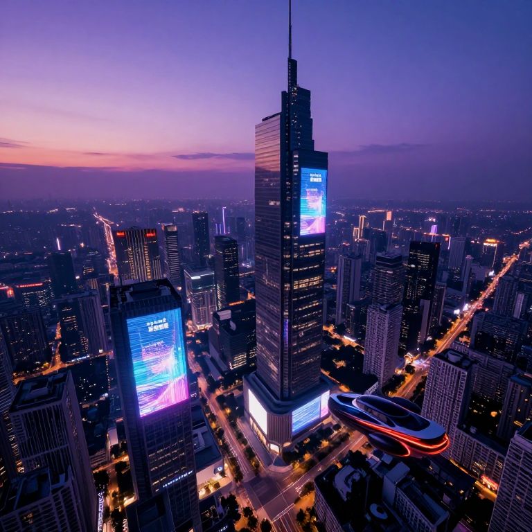 Aerial photograph of a bustling cityscape at dusk, featuring a tall, illuminated skyscraper with vibrant purple and blue lights, surrounded by glowing streets and
