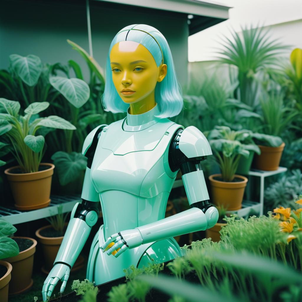 A humanoid AI robot with blue hair and yellow-tinted face, dressed in sleek white robotic armor, tending to plants in a lush greenhouse filled with various potted greenery. The scene is captured with intricate texture and perfect detail, highlighting the combination of advanced technology and nature.