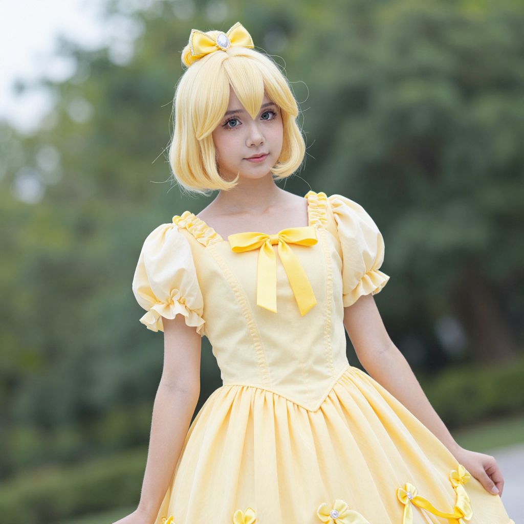 Photograph of a young Asian woman with fair skin and a petite frame, wearing a bright yellow, puffed-sleeve, princess-style dress with a large bow at the chest and another bow on her blonde bob-cut wig. Her large, expressive eyes are accentuated with subtle makeup. She stands outdoors against a blurred green background of trees and bushes. The dress has a voluminous skirt that flares out, and the fabric has a slightly shiny texture. The overall aesthetic is cute and whimsical, reminiscent of anime or cosplay fashion.