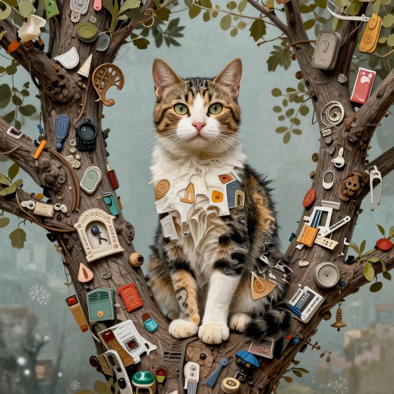 A surreal, chaotic depiction of a whimsical cat sitting on a tree, The tree appears as a collage of random objects, and the cat has fragmented, abstract features, challenging traditional representation
