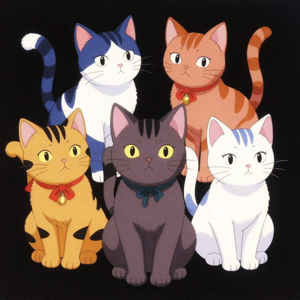 Vibrant colored samurai cats, in an Anscochrome analog film style, cinematic and retro, grainy texture, dynamic composition, art by Yoshitaka Amano