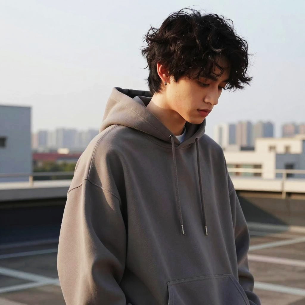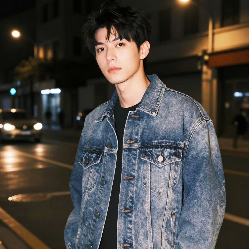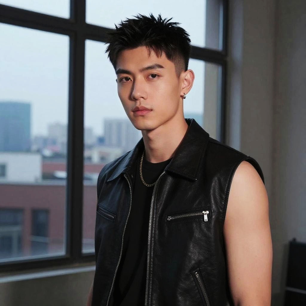 Disconnected Cut hairstyle on male musician, wearing casual bomber jacket, in underground club, captured in fashion editorial style with colorful neon lights.