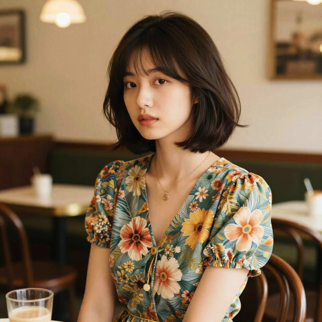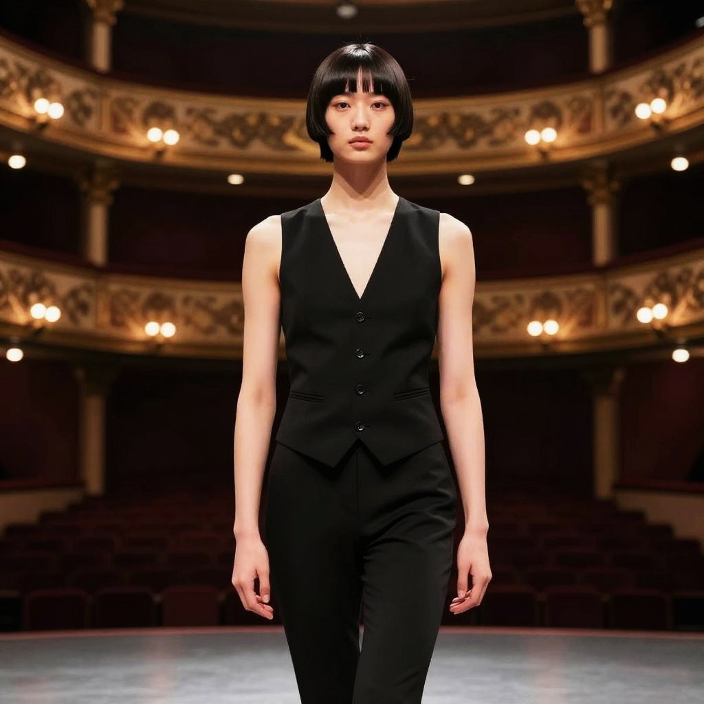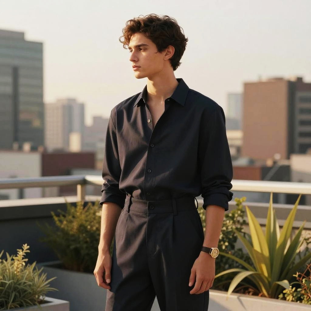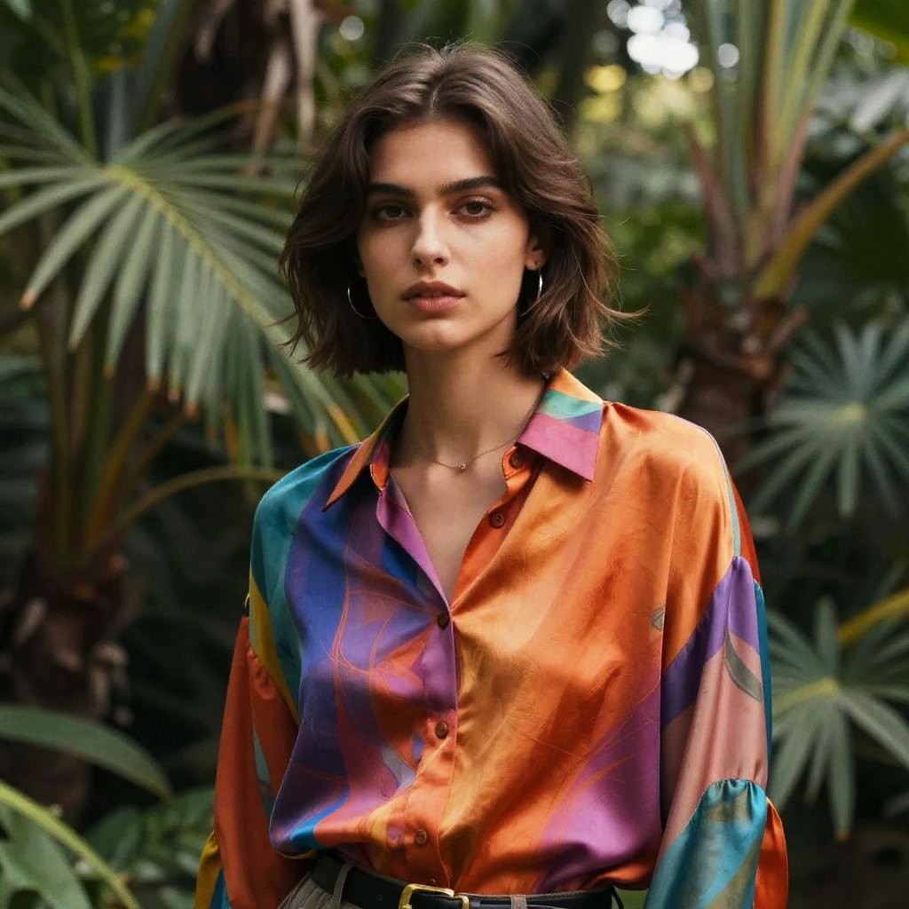 Disconnected Cut hairstyle on male musician, wearing casual bomber jacket, in underground club, captured in fashion editorial style with colorful neon lights.