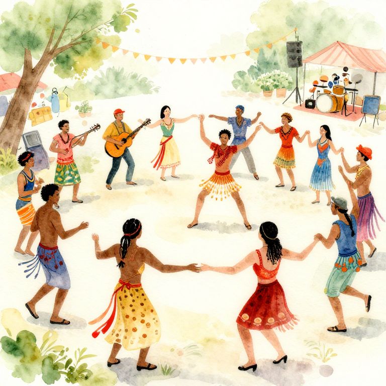 Cultural diffusion image illustrating people from various ethnic backgrounds sharing music and dance in a festive outdoor setting, symbolizing unity and shared heritage, watercolor and ink style