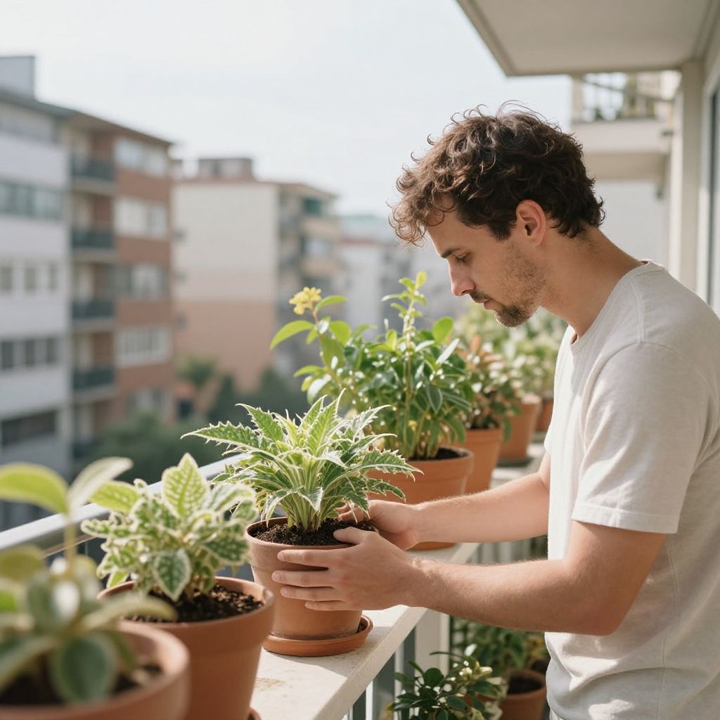 An artistic photo of a man tenderly caring for potted plants on a sunlit balcony with urban apartments in the background, evoking a sense of tranquility and connection with nature in an urban environment.