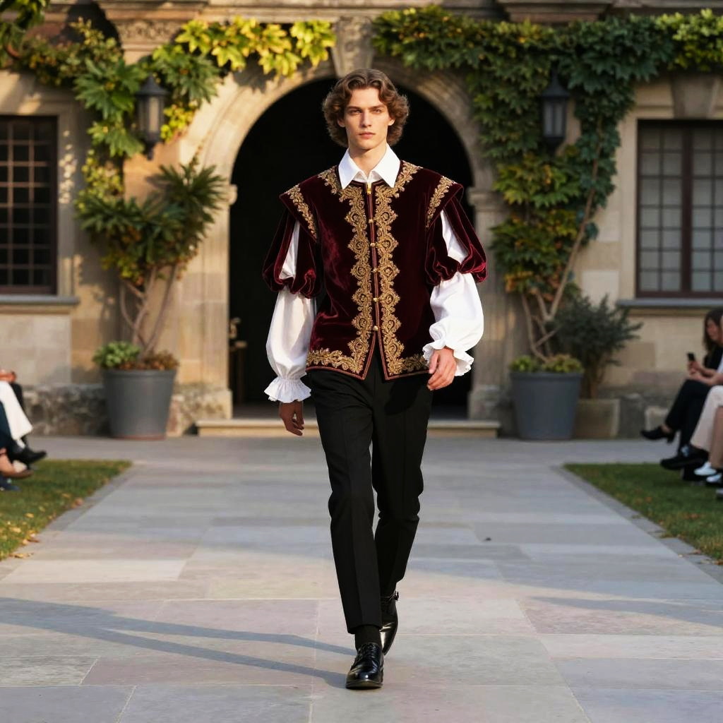 A high-end editorial photograph of elegant Renaissance poet striding a couture runway in historic ivy-covered stone courtyard at golden hour, wearing rich burgundy velvet doublet with gold embroidery, white ruffled shirt, black trousers, and leather shoes. Strong key light from the left casts crisp highlights and a dark-to-light gray gradient across a minimalist backdrop; full-body framing, clean shadows, reflective floor, ultra-detailed textures, futuristic yet elegant mood, minimal props, balanced color, high contrast, magazine-cover energy.