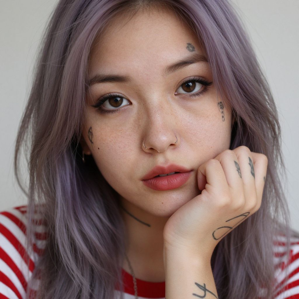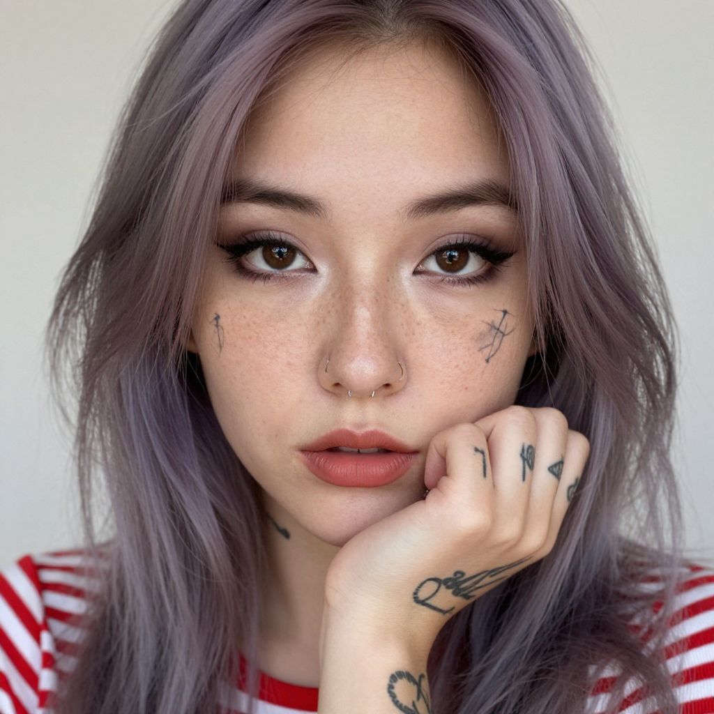 Close-up photo of a young woman with light purple hair, freckles, and multiple tattoos on her face and hand. She's resting her chin on her hand, looking directly at the camera with a neutral expression. She has dark eye makeup, a nose ring, and red lipstick. She's wearing a red and white striped top. The background is blurry and white.