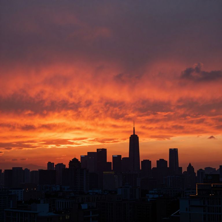 A dramatic sunset bathes the cityscape in vibrant hues of red and orange, creating a striking contrast against the dark silhouettes of buildings below, captured in a high-definition digital rendering that emphasizes the timeless beauty of the golden hour.