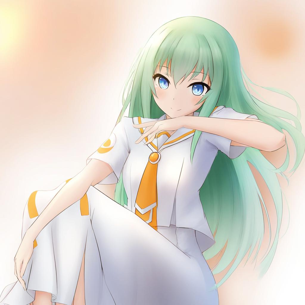 Alice carroll, aria (manga), 1girl, blue eyes, green hair, long hair, orange planet uniform, uniform, orange planet uniform, uniform, white dress, long dress, by artist naokomama, leet