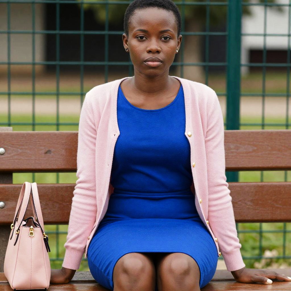 A photograph of a dark-skinned woman with short, curly hair sitting on grass. She wears a brown, floral-patterned dress with long sleeves. She leans against a tree, with tall green plants and a white building in the background. She has a neutral, slightly intense expression. Her dress is slightly wrinkled, and her left hand rests on her lap. Grass and plants surround her.
