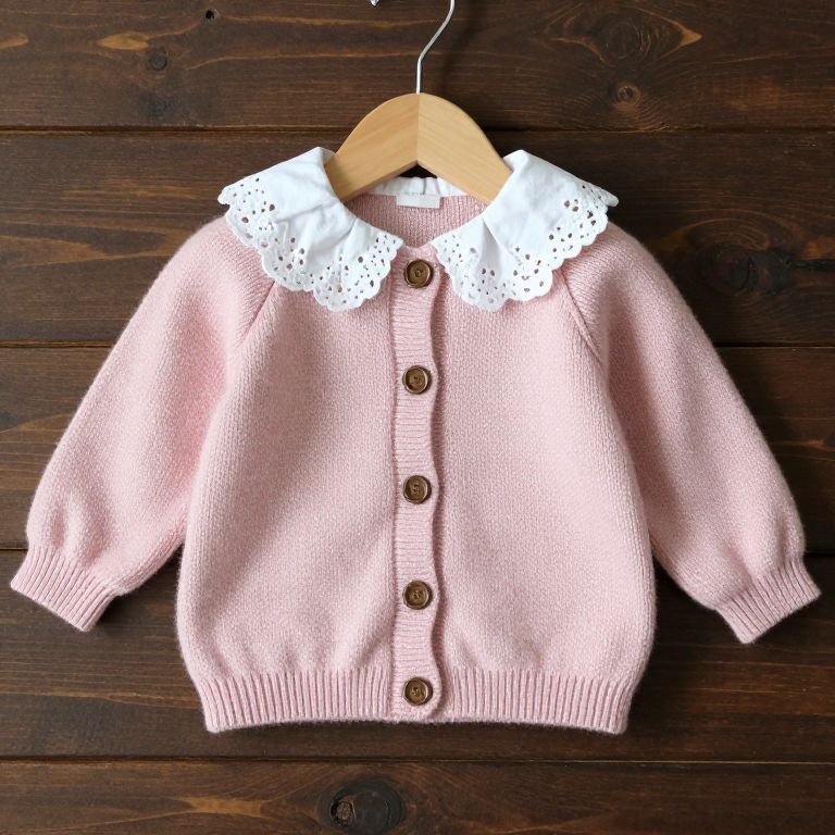 Photograph of a pink, long-sleeved, knitted cardigan for a child, displayed on a wooden hanger against a dark, textured wooden background. The cardigan features a white, eyelet lace collar with small circular holes and is fastened with four brown, round buttons down the front. The fabric has a soft, cozy texture with ribbed cuffs and hem. The cardigan's light pink color contrasts with the dark wood, highlighting its delicate, feminine design. The hanger is simple, light wood, and the cardigan is centered in the frame.