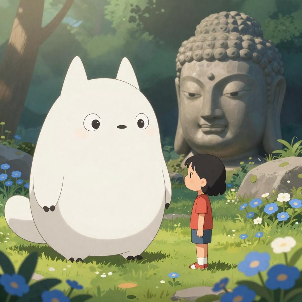 Digital illustration of a young girl with brown hair, wearing a gray top and yellow backpack, gently touching the face of a large, white, fluffy creature with closed eyes. Soft pink and blue gradient background. The girl's right hand rests on the creature's cheek. The creature's large, white, furry ure contrasts with the girl's smaller size. The girl looks up at the creature with a calm expression. Both figures are centered in the image.