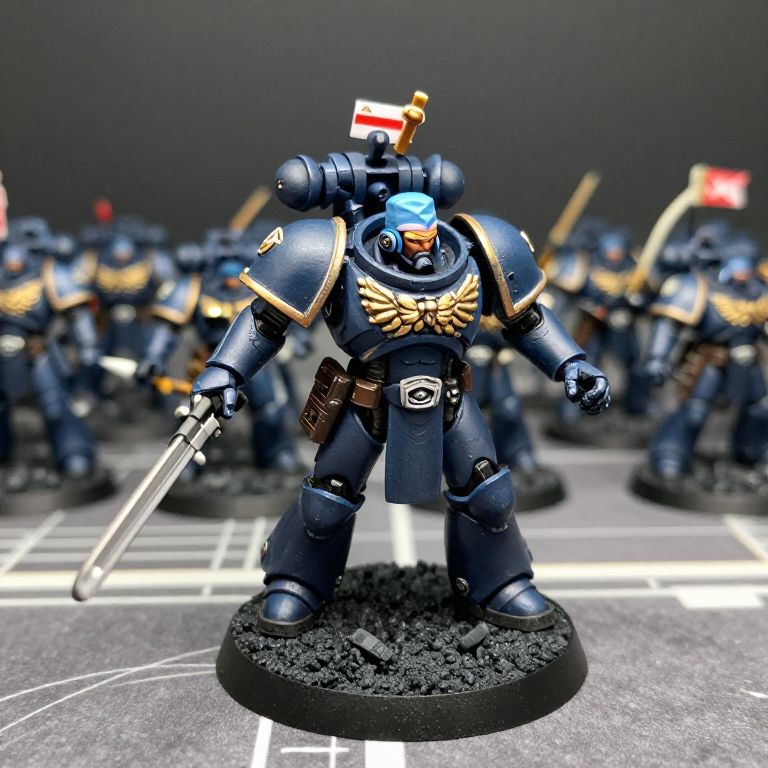 A highly detailed and meticulously painted miniature figure of a Mecha surgeon in dynamic pose, set against a low-depth-of-field background featuring a tabletop battle with numerous Warhammer 40,000 miniatures.