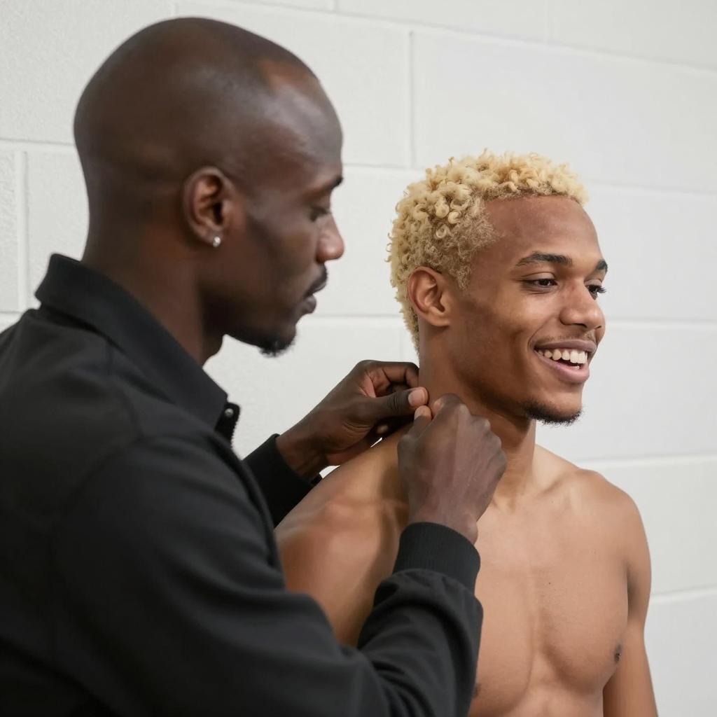 Two Black men in a close-up photograph. The bald man on the left with dark skin, wearing a black jacket, grabs the blonde-haired man's neck with both hands. The blonde-haired man with light brown skin, shirtless, smiles with his mouth open. The background is a white cinder block wall. The bald man's left ear has a small earring.