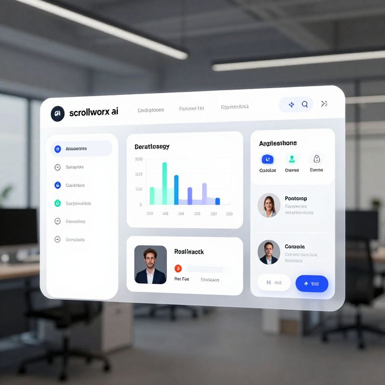 A clean, modern AI interface titled 'scrollworx ai' with smooth animations, glass-morphism design, and floating panels showing content generation, real-time analysis, and user interaction in a sleek tech office atmosphere.