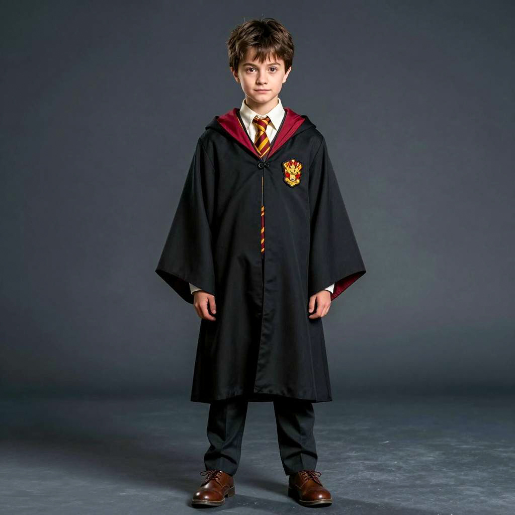 Harry potter female, photograph of a young woman, full body, standing in front of a ured concrete wall, dressed in a Hogwarts-inspired school uniform, dark blue robe with red trim, brown V-neck sweater, olive green pleated skirt, white collared shirt, brown knee-high boots with white laces, wavy brown hair in pigtails, neutral expression, natural light, realistic style, casual pose, slight shadow on wall