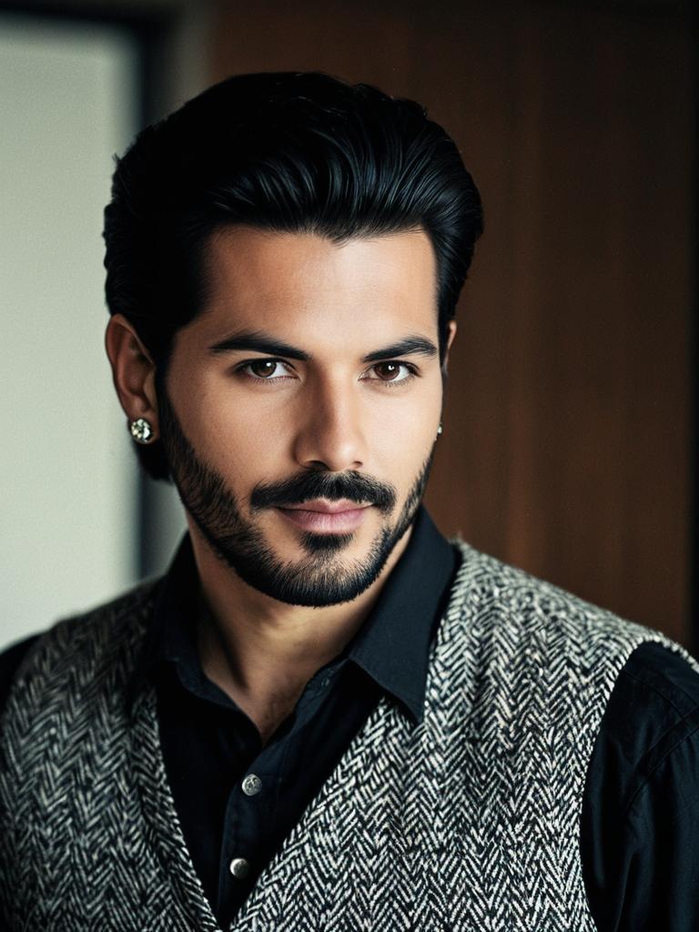 Portrait of a young South Asian man wearing an indo western casual outfit consisting of a white shirt with black detailing, black pants, a brown leather belt, and a brown jacket with black lapels. He has medium-length black hair, facial hair, and stands confidently with hands in pockets against a plain blue background.