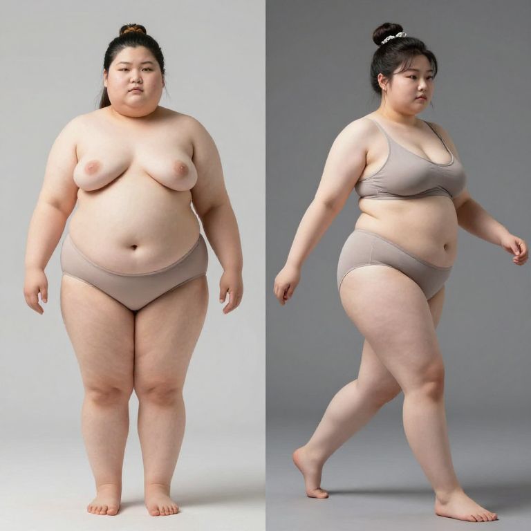 Photograph of a plus-size Asian woman with light skin, black hair in a bun, wearing beige underwear, standing and walking, showing her full figure