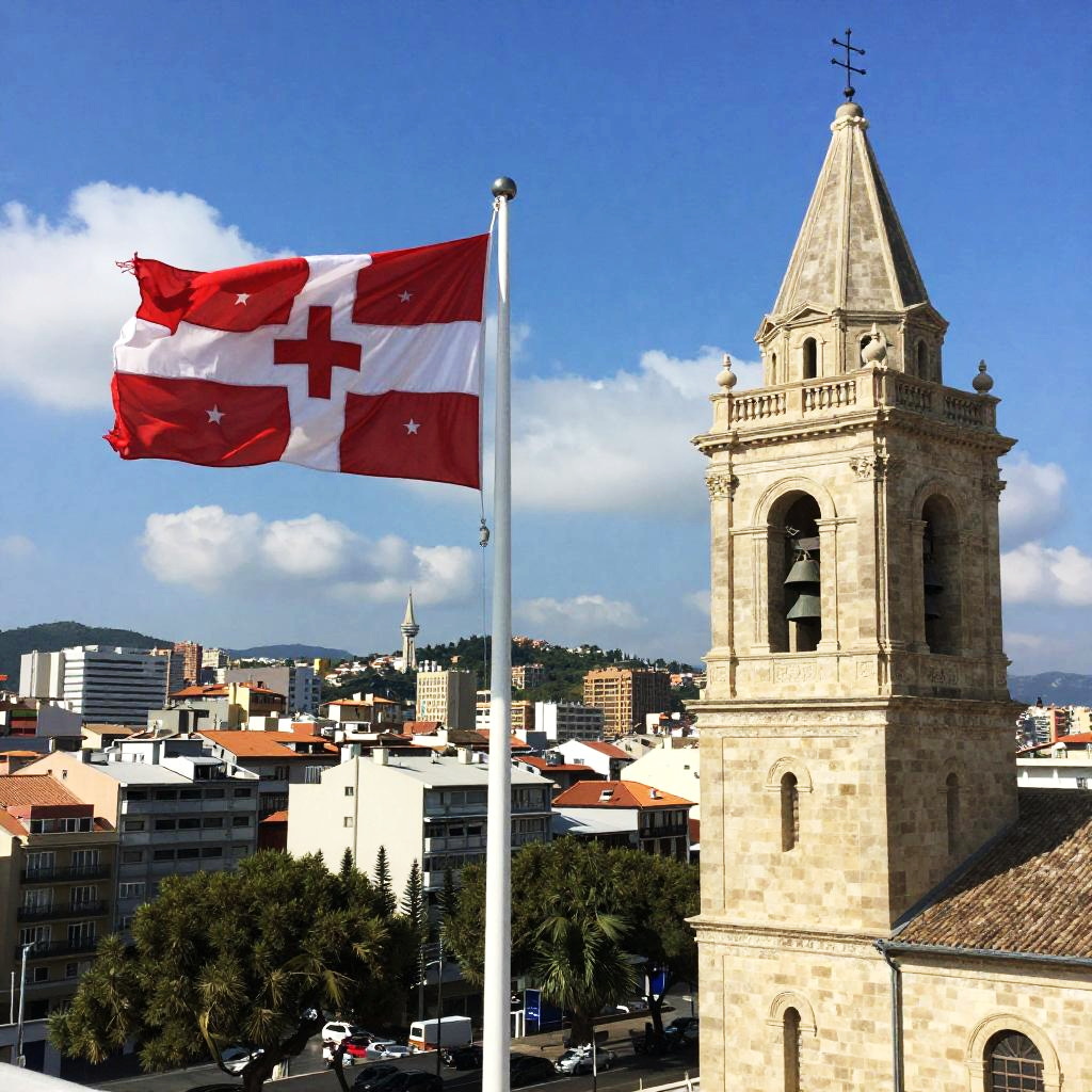 Photograph of a sunny cityscape featuring a prominent beige stone bell tower with arched windows on the right. A red and white flag with a cross and four stars flutters on a pole in the foreground. In the background, there's a mix of buildings with hills and a tall tower under a bright blue sky with scattered clouds. Lush greenery is visible at the base of the buildings.