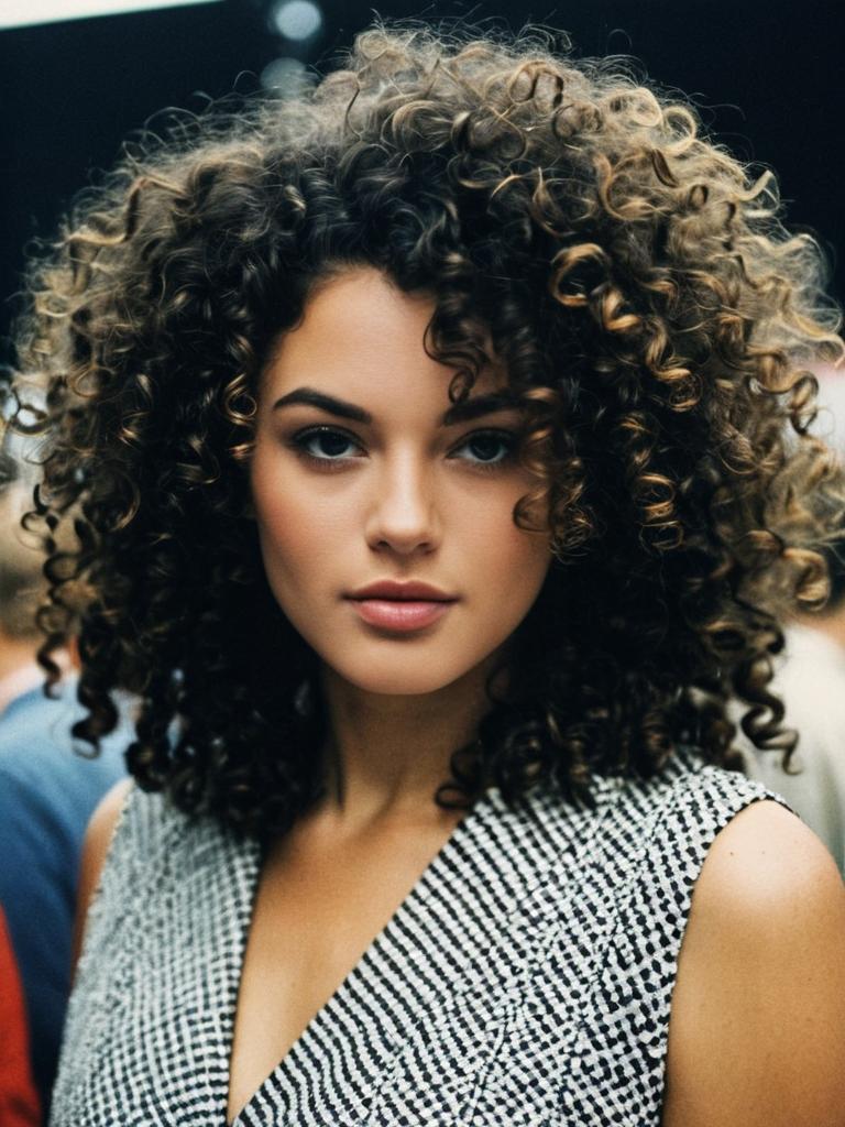 Close-up photorealistic portrait of a young woman with voluminous curly hair and light brown highlights, wearing a patterned top, set against an outdoor blurred natural background. The image captures a cinematic and realistic mood with soft lighting.