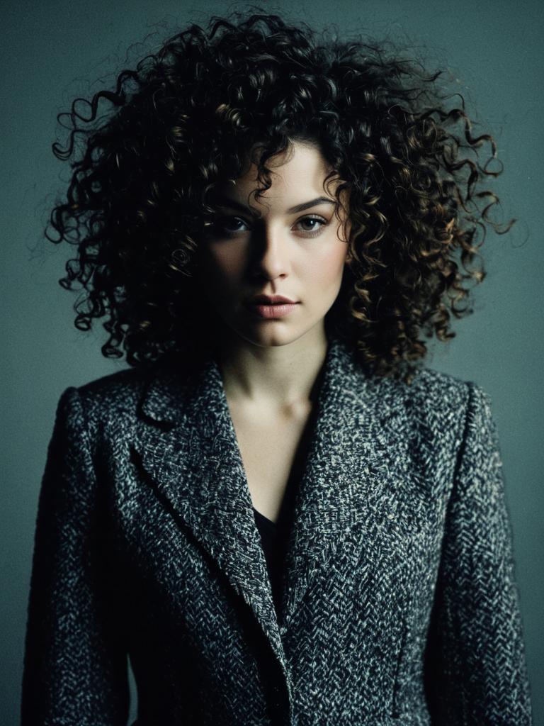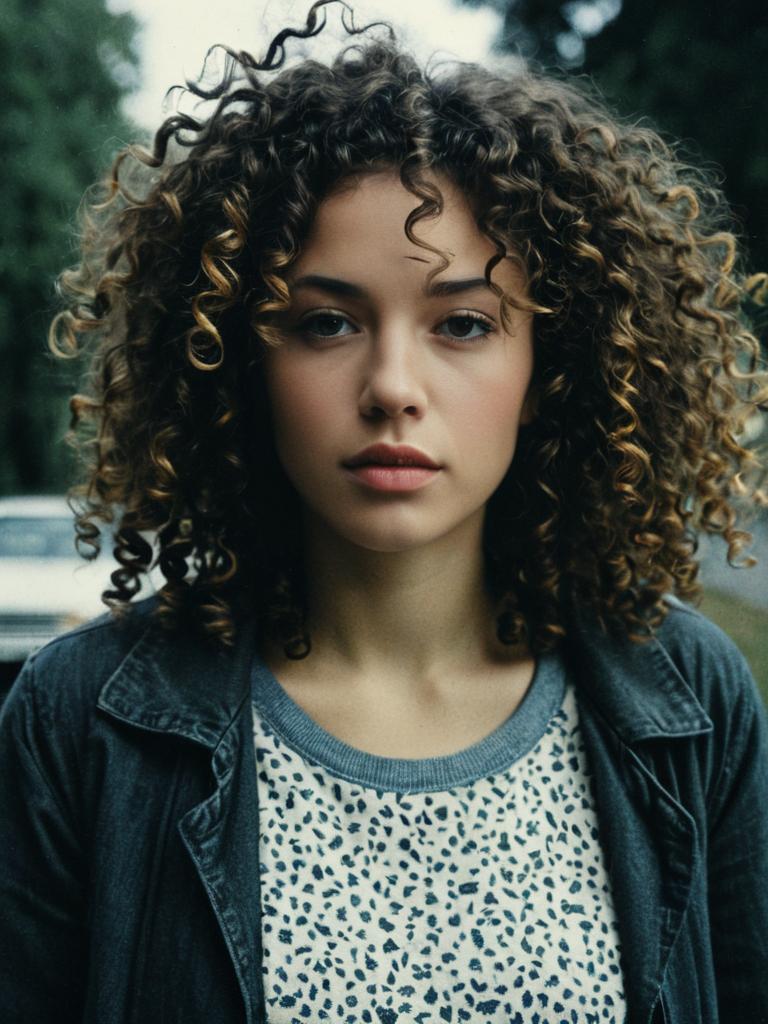 Woman with Curly Hair, photorealistic outdoor portrait, cinematic realism