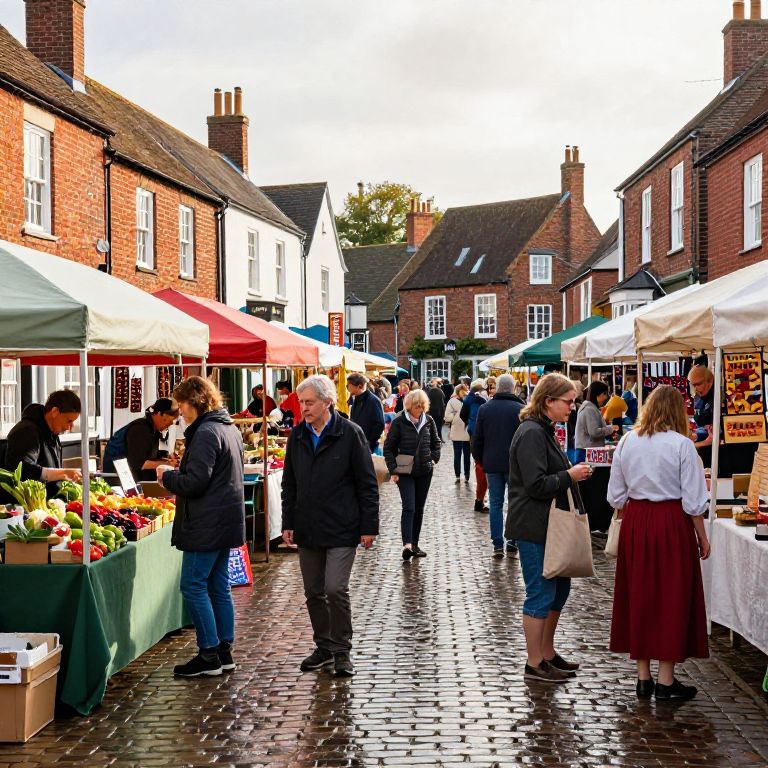 Photograph of a vibrant outdoor market on a cobblestone street in a quaint, historic town. Red-brick and white-painted buildings with dark roofs line both sides. Colorful market stalls with red, green, and white canopies display fresh produce, including vegetables and fruits. Shoppers, dressed in casual and semi-formal attire, browse the stalls. The street is wet, reflecting the market scene. People of various ages and backgrounds, including an elderly man in a dark coat and a woman in a white blouse and red skirt, are visible. The background shows more market stalls and trees under a partly cloudy sky.