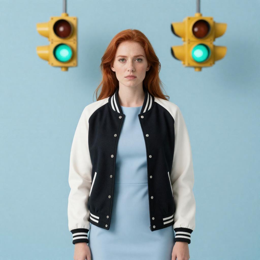 Young woman with short blonde hair, wearing a light blue dress under a navy and cream varsity jacket, standing in an industrial warehouse aisle. Metal shelves filled with boxes surround her. Overhead fluorescent lights illuminate the scene. She has a neutral expression. Warehouse setting is cluttered, with a narrow aisle leading into the background.