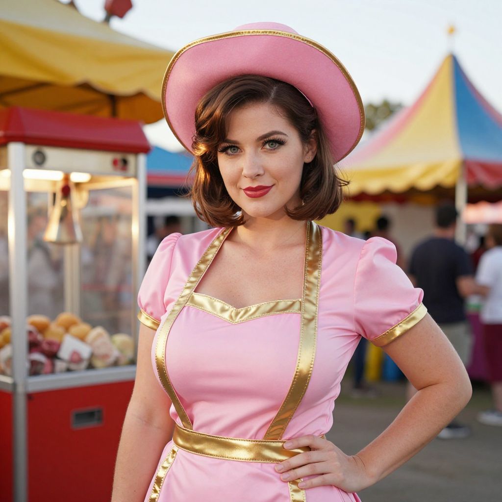 A vibrant outdoor carnival scene with a woman of short, medium brunette hair and clear green eyes standing confidently in a retro 1950s-themed costume — a pink and gold diner waitress outfit with a matching apron and large hat — the backdrop showing popcorn machines and colorful tents, her face showing a friendly, confident expression with a soft glow in the evening light.. The woman has big tits and cute face