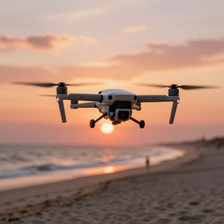 Photograph of a white drone with black blades flying over a sandy beach at sunset, with a vibrant orange-pink sky and a distant, blurry figure