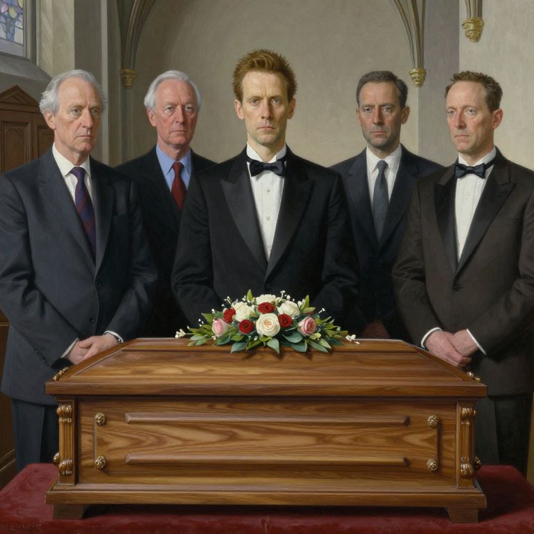 A photograph of five men standing in a formal setting, dressed in black tuxedos with white shirts and black bow ties, surrounding a wooden coffin adorned with a bouquet of red, white, and green flowers. The men, aged from middle-aged to older, have varying hair colors and styles, with three having white hair and two with dark hair. The background features a beige wall, wooden paneling, and an arched window with stained glass. The men stand solemnly, with the central man in the foreground looking directly at the camera. The image conveys a somber, mourning atmosphere.
