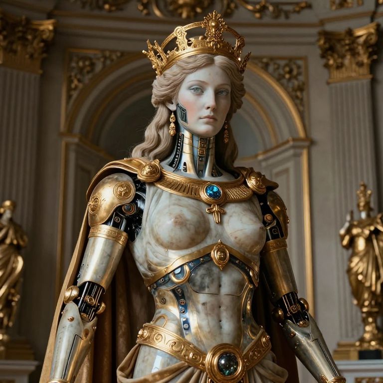 A hyper-detailed, ornate portrait of a greek Cyborg God, featuring intricate gold accents, dramatic lighting, and arococo interior, reminiscent of Sally Mann and Guilermo del Toro's styles.
