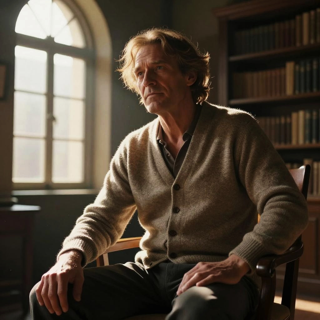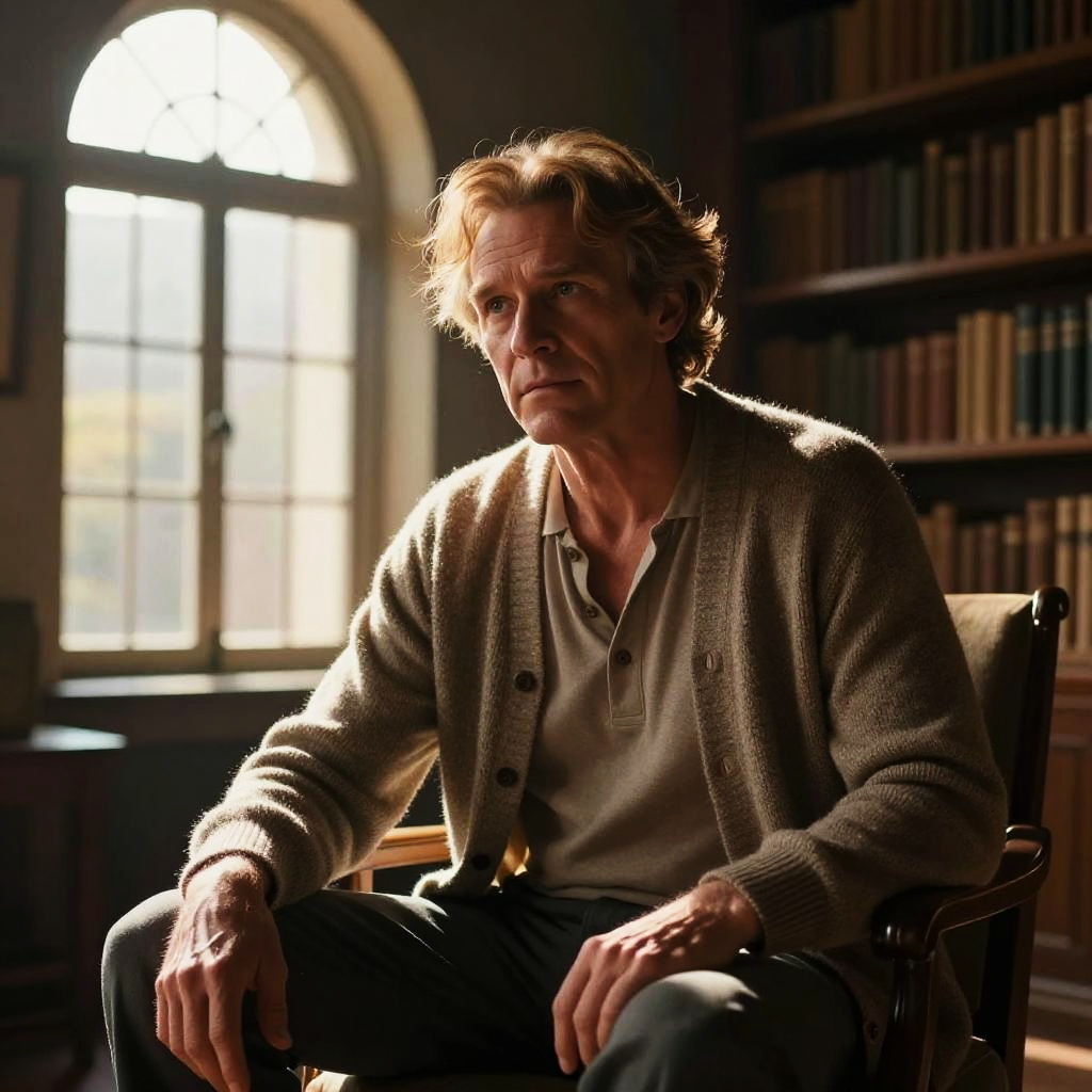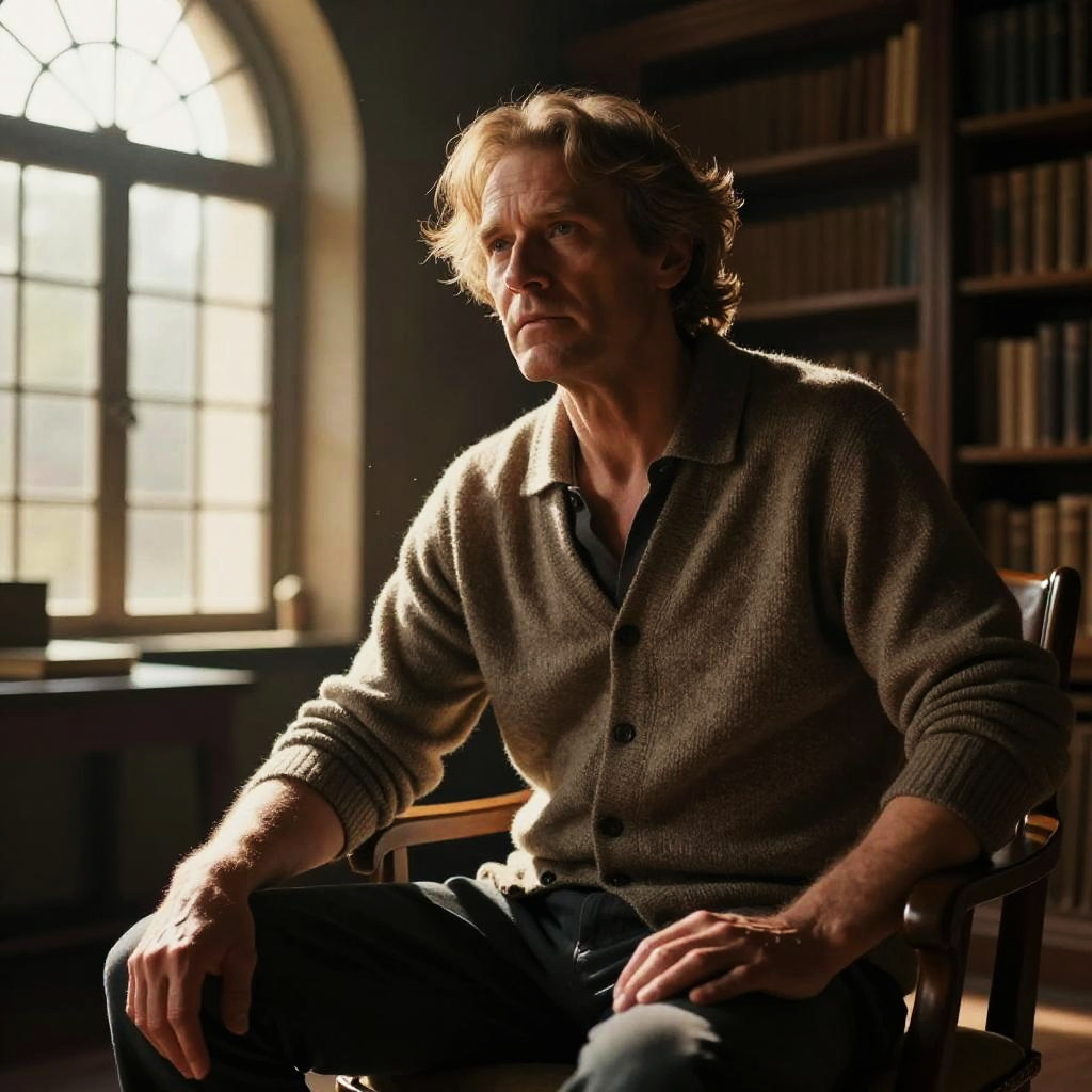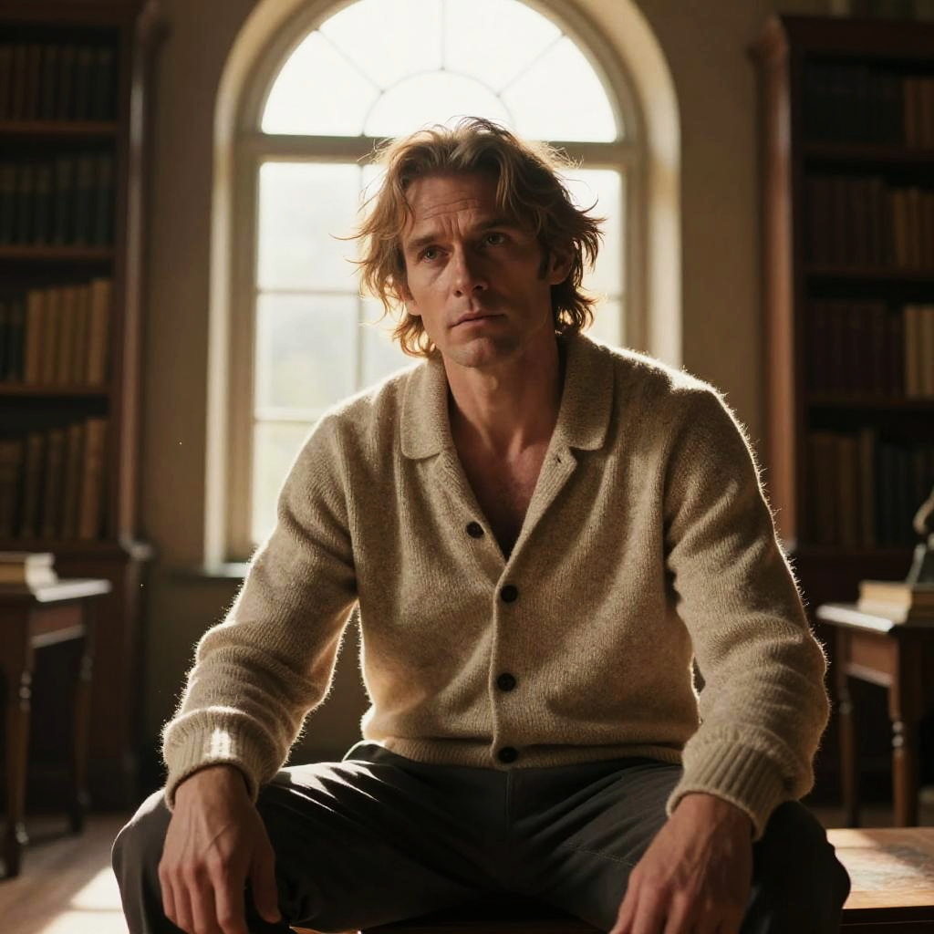 Photograph of a middle-aged Caucasian man with wavy, light brown hair and a serious expression, seated in a dimly lit library. He wears a beige cardigan over a white polo shirt and blue jeans. The warm, backlit sunlight streams through a large, arched window behind him, casting soft shadows. The background features tall bookshelves filled with books. The man's skin is fair, and his hands rest on his lap. The overall tone is warm and introspective, with a focus on the man's thoughtful demeanor and the serene library setting.