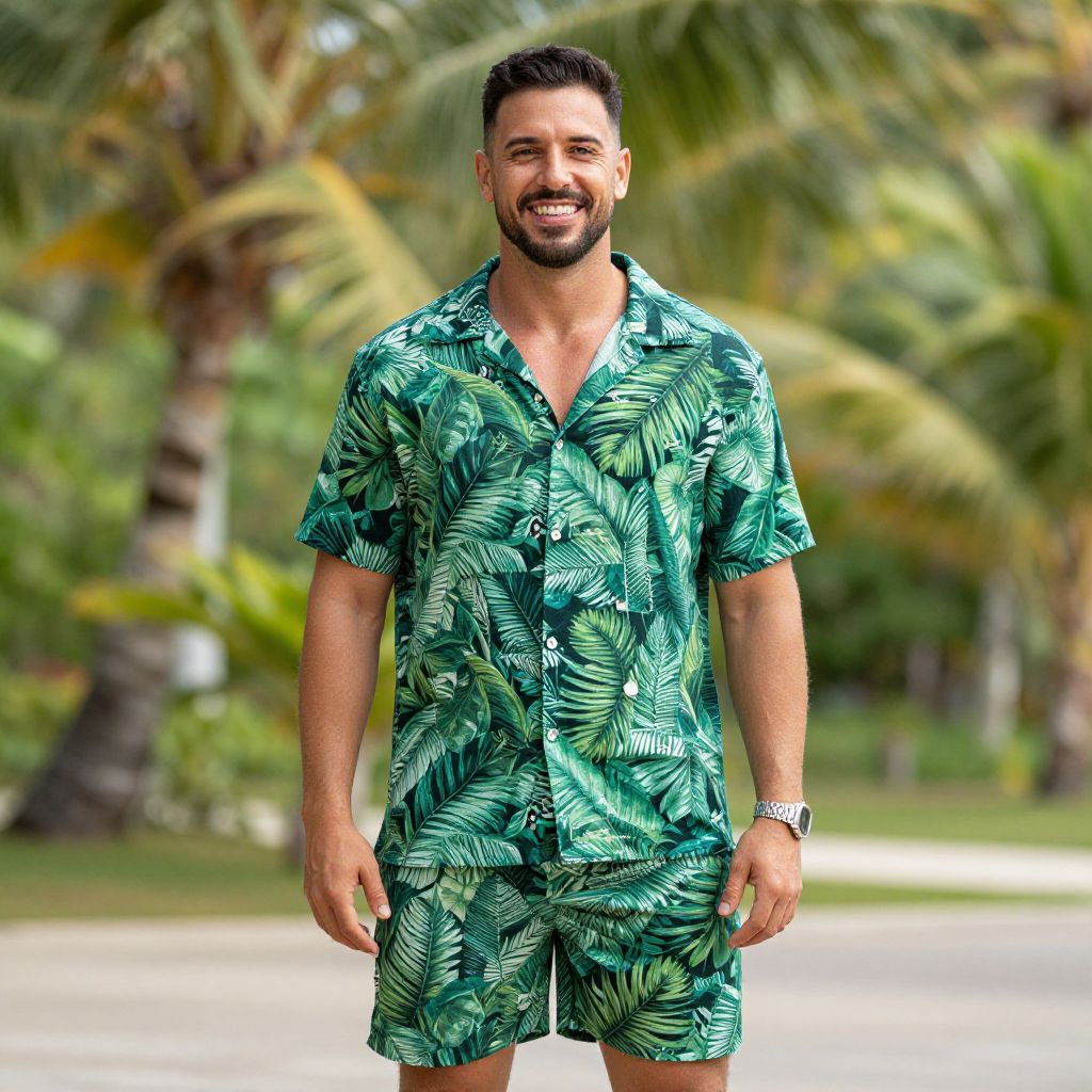 An artistic photograph featuring a smiling man in a tropical setting, dressed in a vibrant green foliage-patterned shirt and shorts, exuding a relaxed and summery vibe.