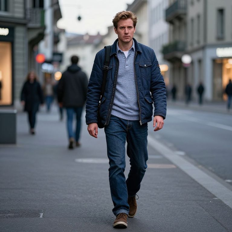 Embroidery Fabric Marker realistic full-body portrait of a private investigator following someone in a street of geneva, casual clothes in 2023, kodak portra, 8k, f2.8, evening lighting,