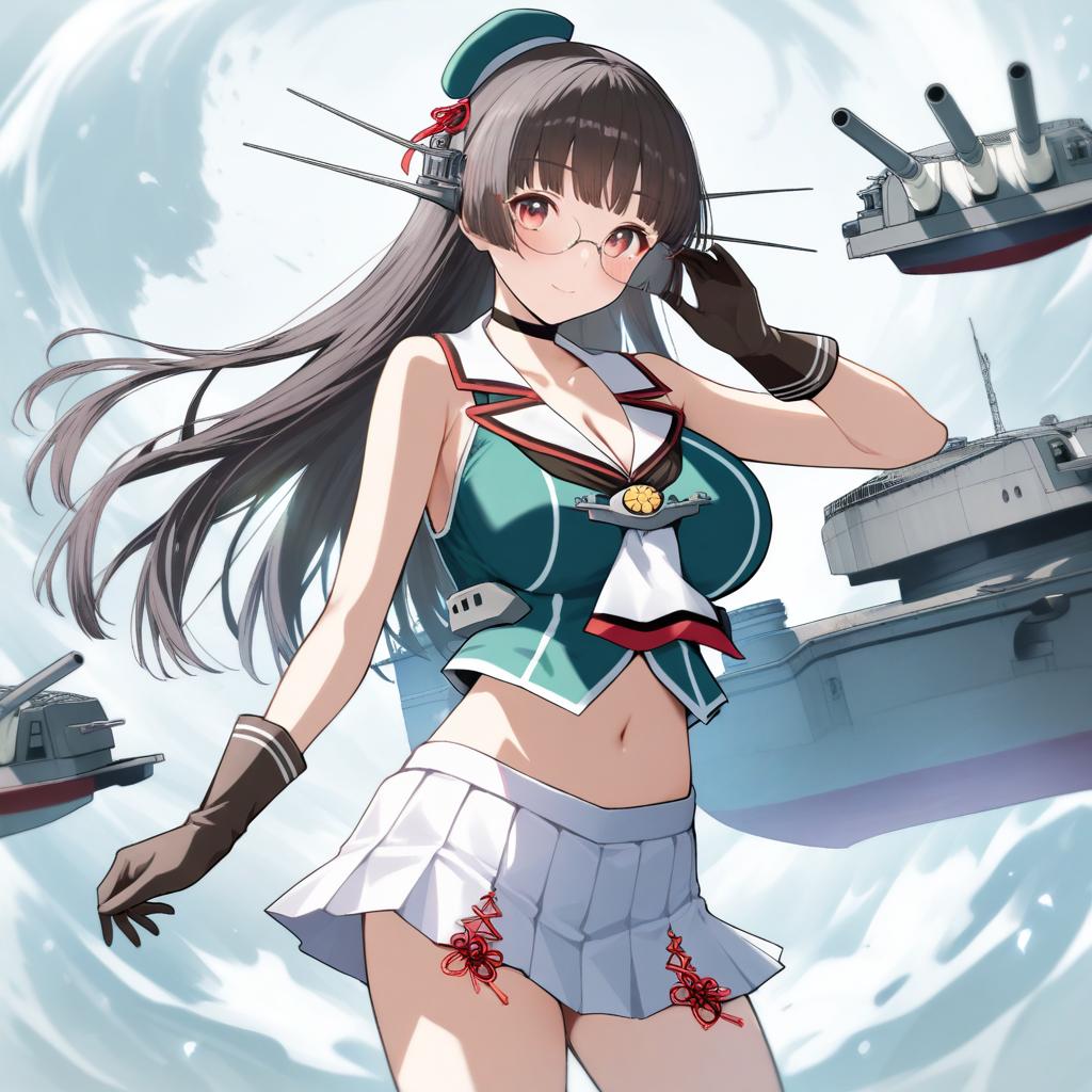 Choukai kai ni (kancolle), kantai collection, 1girl, red eyes, glasses, rimless eyewear, long hair, black hair, hair ornament, large breasts, cleavage, navel, black gloves, pleated skirt, mini hat, beret, headgear, midriff, by artist kitaku (nakamachi machi), animagine