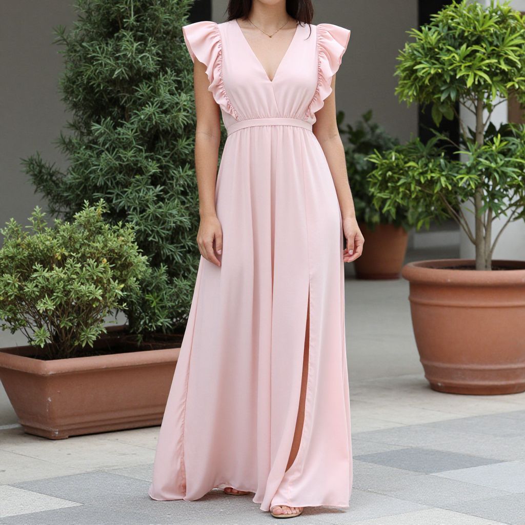 Woman wearing a flowing pink maxi dress with ruffled sleeves and front slits, standing outdoors on a paved pathway surrounded by green potted plants and a small tree.