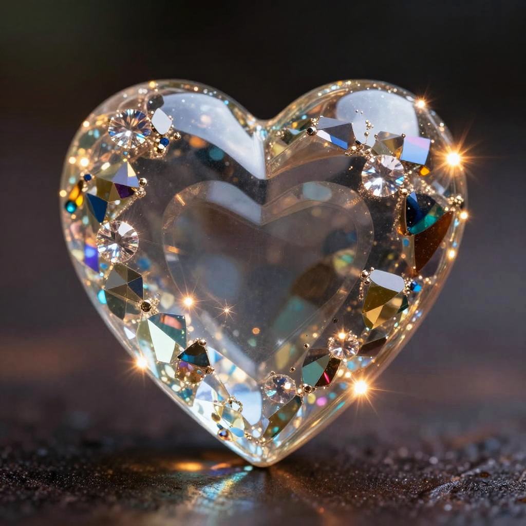Close-up macro photo of a transparent heart-shaped glass ornament decorated with multicolored sparkling facets and crystals. The light shines through the intricate glasswork, creating a magical and surreal effect with warm glowing reflections. The heart features detailed geometric elements and a glossy surface, set against a dark blurred background.