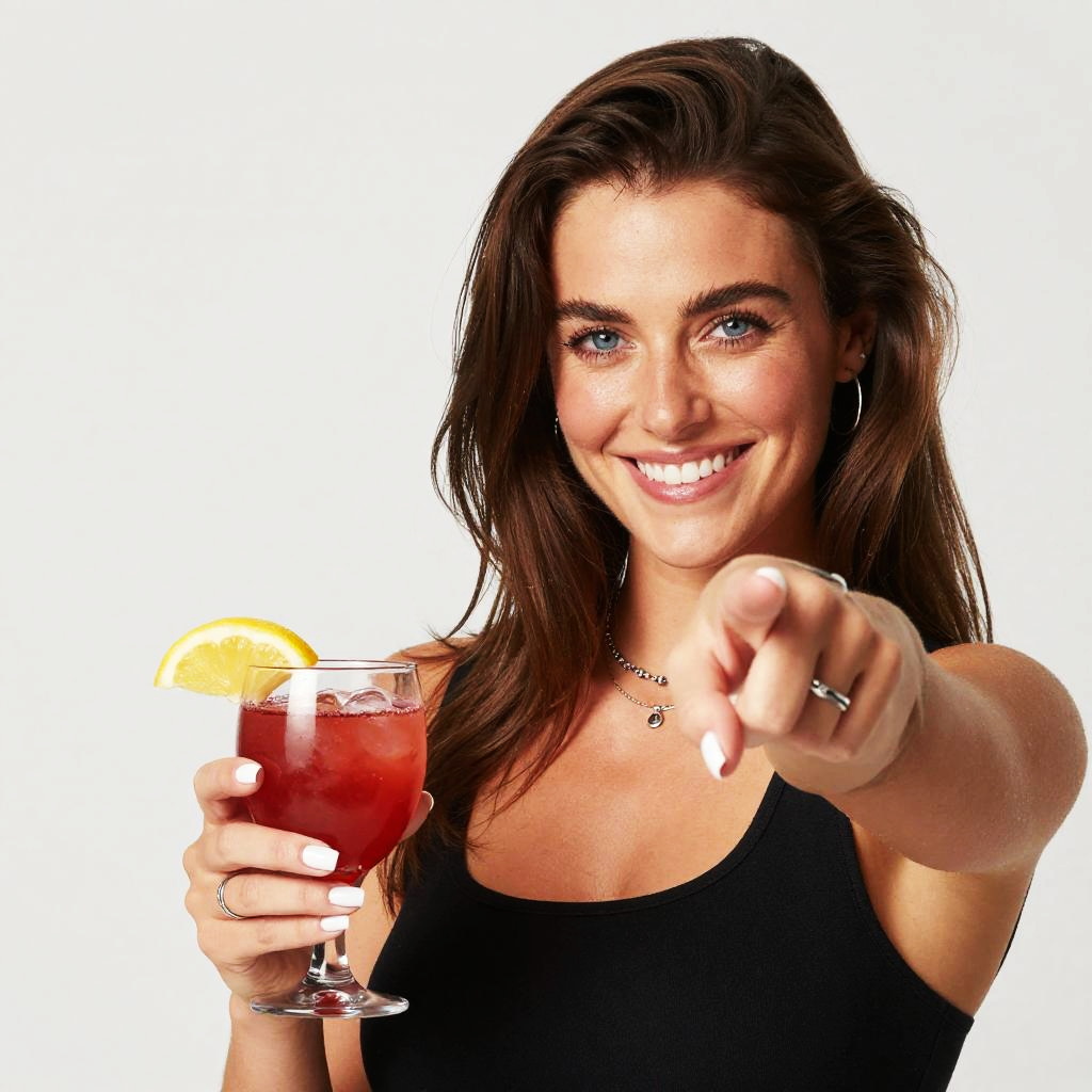 Photograph of a smiling woman with long, wavy brown hair and blue eyes, wearing a strapless, bright red dress. She holds a clear, empty wine glass in her right hand, raised slightly. She has fair skin, wears a delicate silver necklace with a small pendant, and a simple ring on her right index finger. The background is stark white with a light blue border, emphasizing her cheerful expression and vibrant dress. The image has a high-contrast, polished look, typical of professional studio photography.