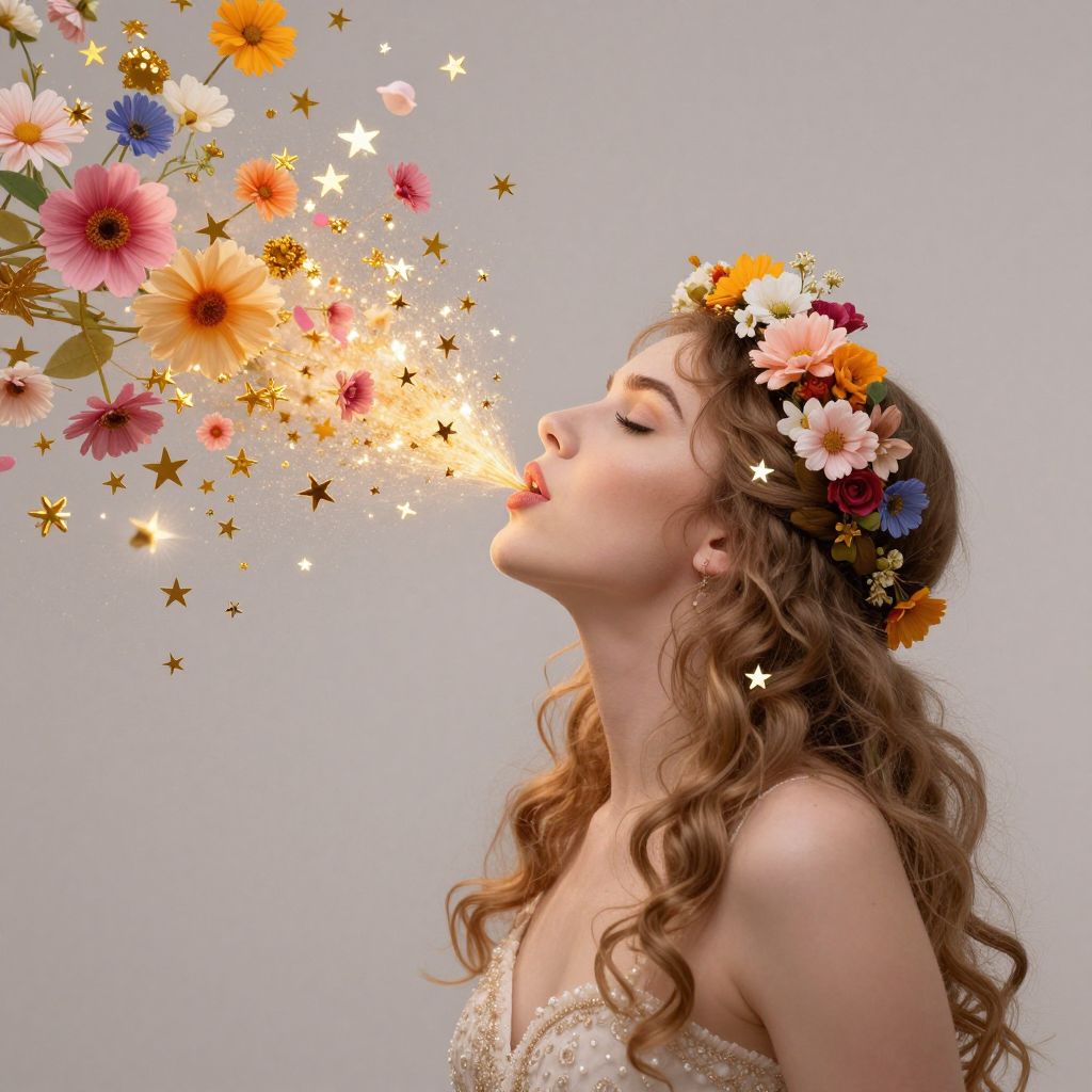 Photograph of a fair-skinned woman with wavy, light brown hair wearing a floral crown of multicolored flowers. She has her eyes closed and lips slightly parted, blowing a burst of colorful flowers and golden stars from her mouth. She is dressed in a white, strapless dress with delicate lace details. The background is a simple, light gray, emphasizing the vibrant colors of the flowers and stars. The image has a whimsical, magical feel, with a soft, dreamy texture and a focus on the woman's serene expression and the dynamic, sparkling effect of the blown flowers.