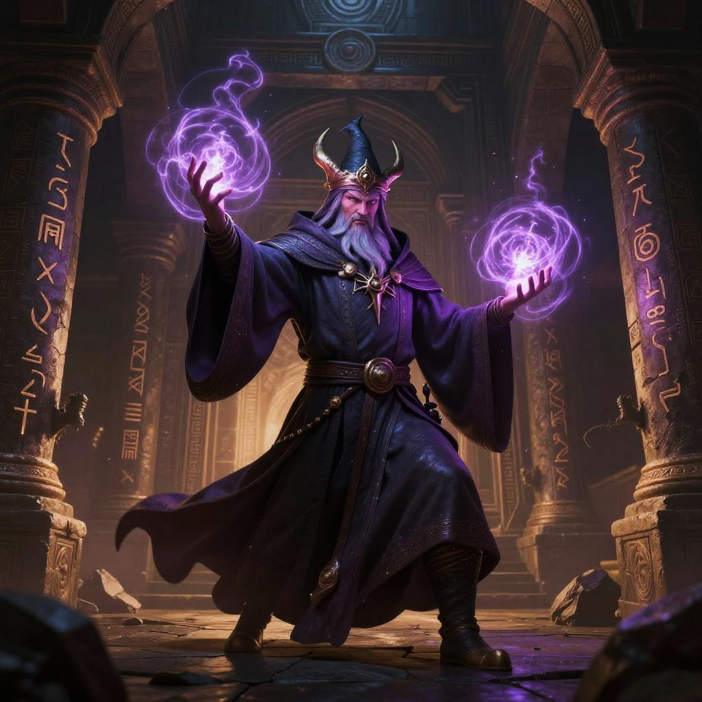 Mystical Wizard Casting Spells in Temple