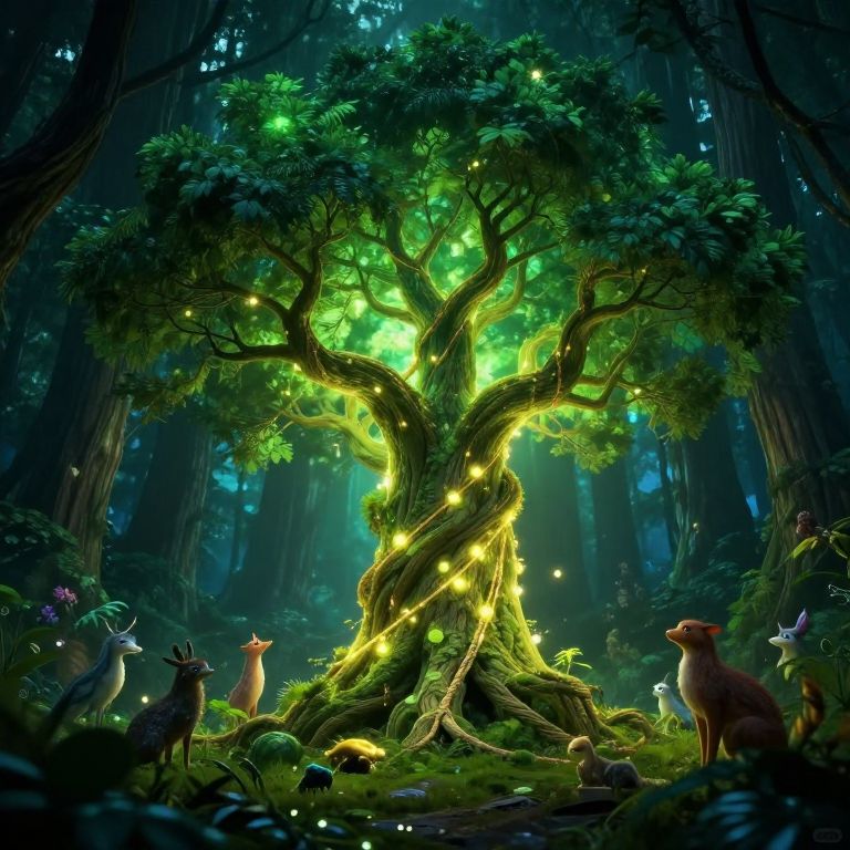 Vida theme showing a radiant tree of life with sprawling roots and branches, surrounded by fluttering butterflies and soft, warm light beams piercing through a misty forest, creating a mystical, serene vibe.