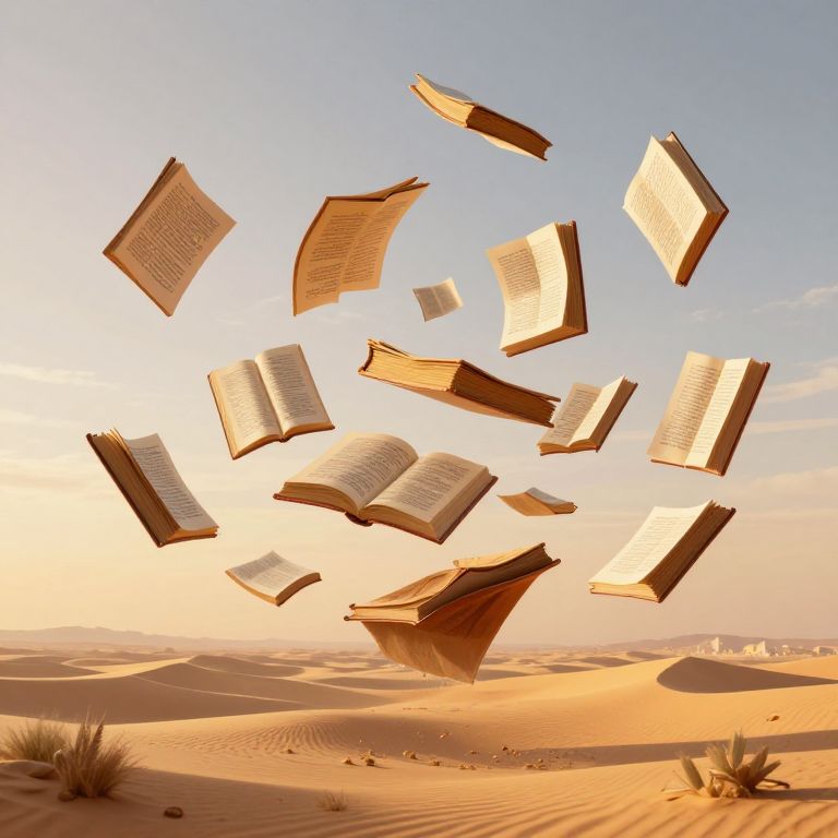 Photorealistic digital artwork of a tall, wooden bookshelf building with multiple stories of uniformly arranged books. The building stands in a desert with rippling, sunlit sand, casting shadows. A circular, glowing blue pool of water is at the base, reflecting the building's shadow. The sky above has swirling, cloud-like patterns in shades of blue and white, adding a surreal touch. The textures of the sand, wood, and water are highly detailed, enhancing the realism. The scene combines natural and fantastical elements, creating an otherworldly atmosphere.