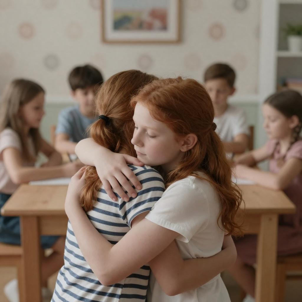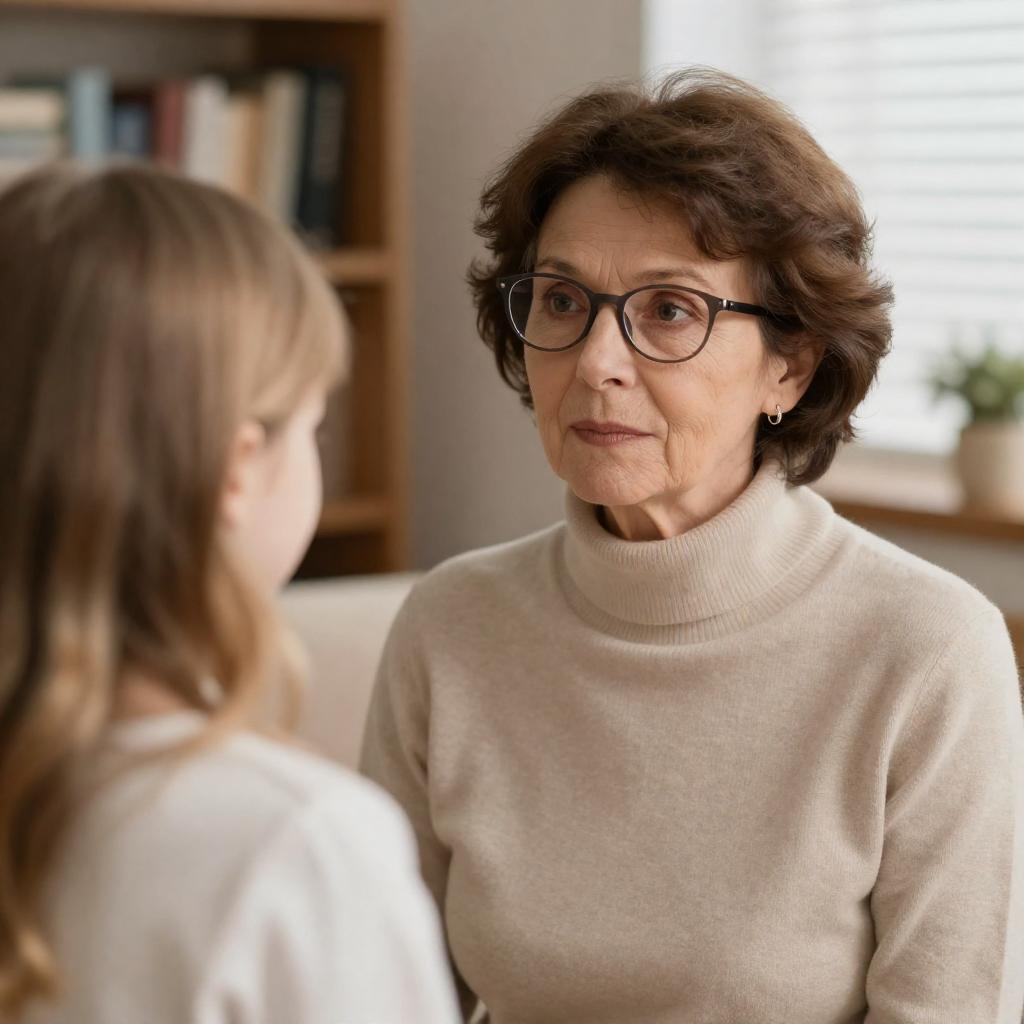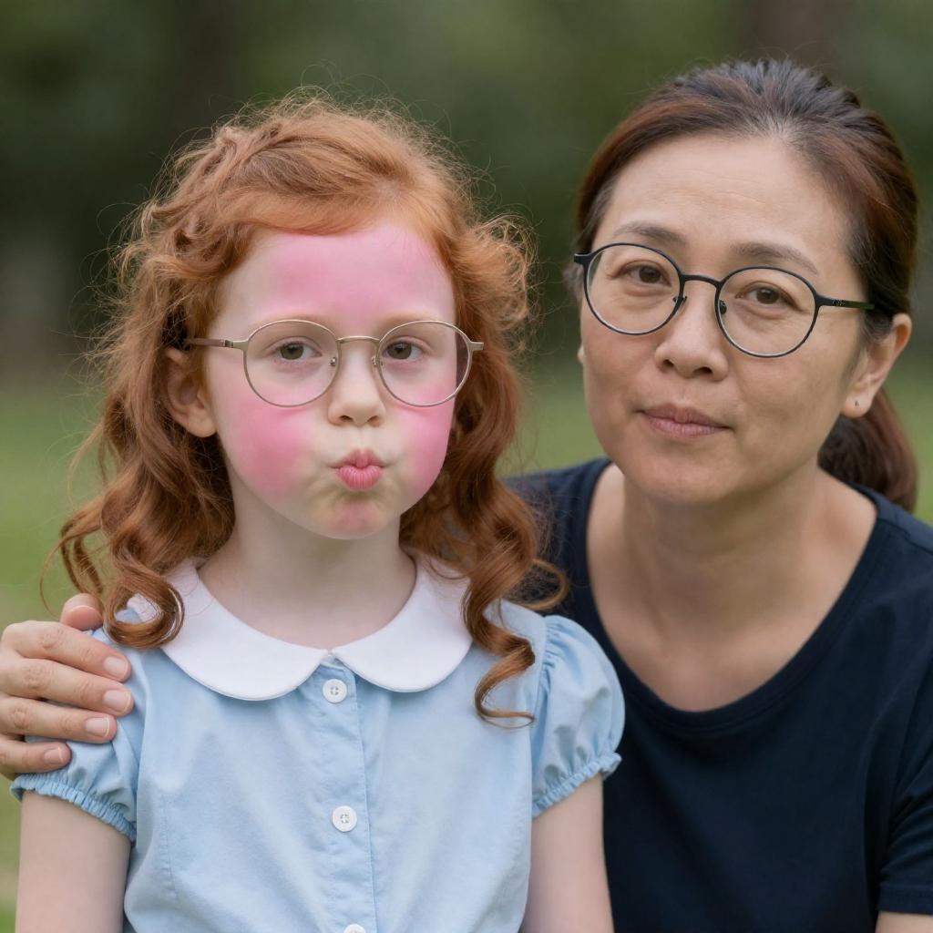 Photograph of a young girl and an older woman with pink faces, wearing glasses and a dress with a white collar. The girl has curly red hair, pink cheeks, and pouts slightly. The woman has brown hair pulled back, round glasses, and a neutral expression. The older woman's hand rests on the girl's shoulder. Green blurred background.