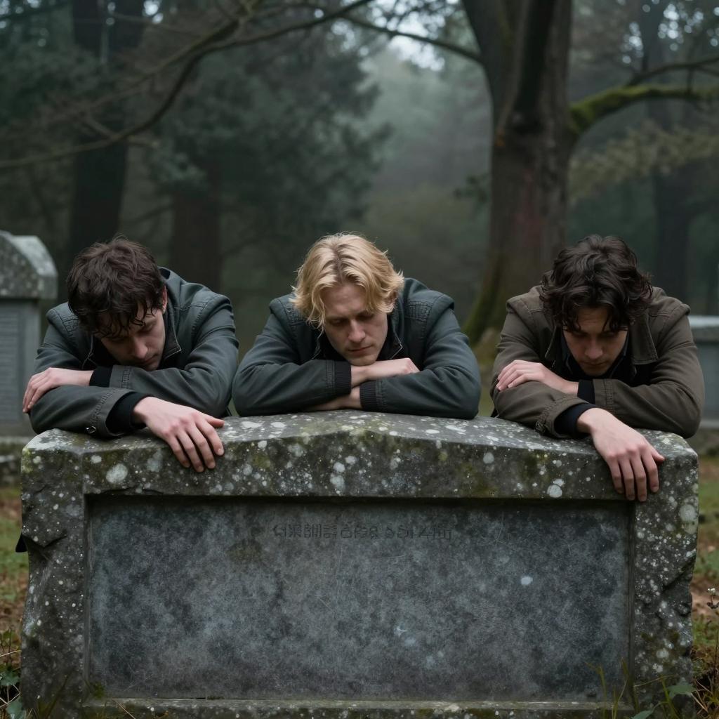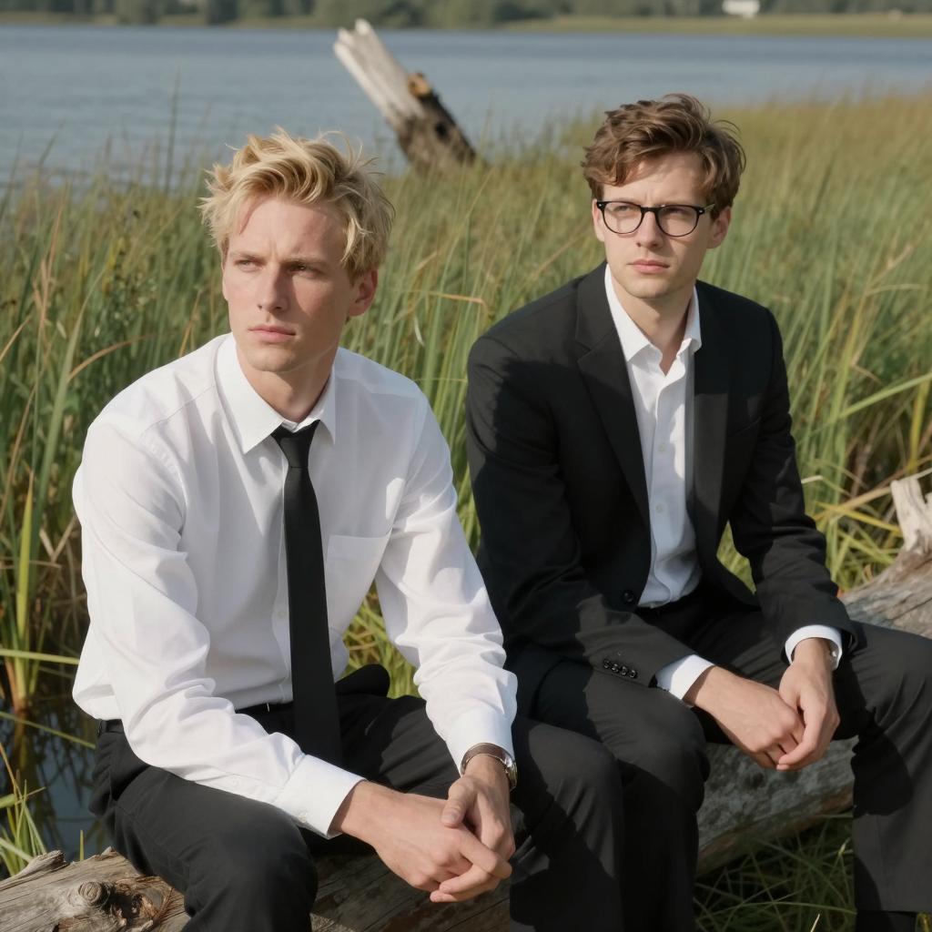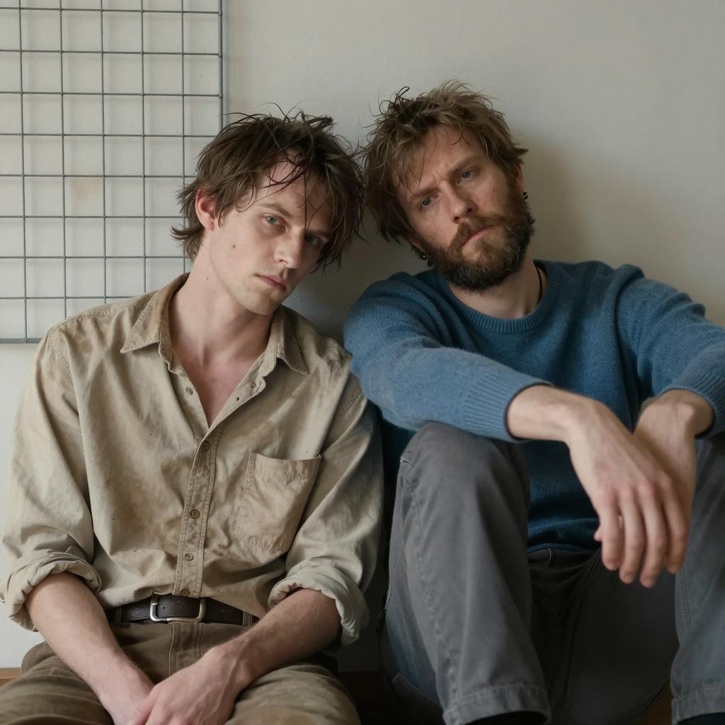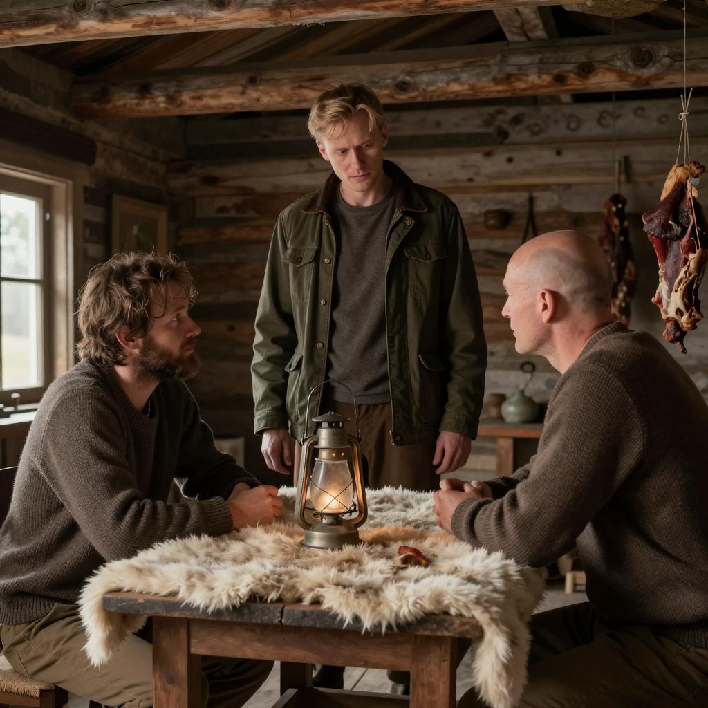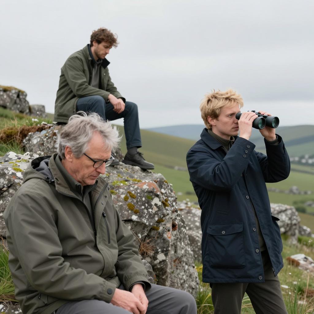 Two men crouch on a grassy hill. Left man wears black, crouches low, holds small green bottle. Right man wears brown jacket, crouches slightly higher, holds small metal container. Large, gray, castle-like house with multiple turrets in background. Overcast sky. Dry grass covers hill. Men focus on their objects.