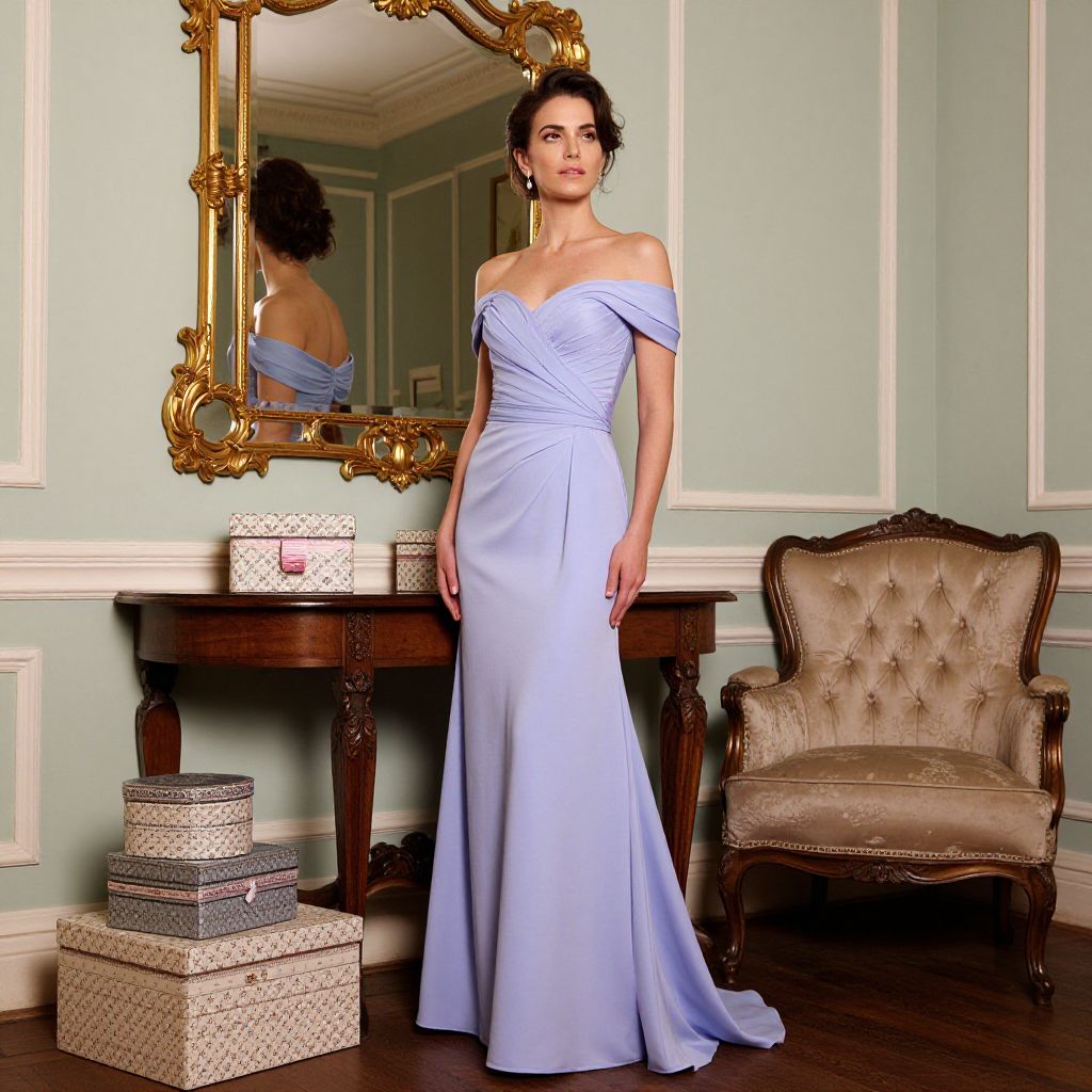 Elegant woman in a lavender off-the-shoulder gown stands gracefully in a vintage-inspired room, framed by a gold-framed mirror above a wooden table adorned with patterned boxes, while a plush armchair sits in the background.