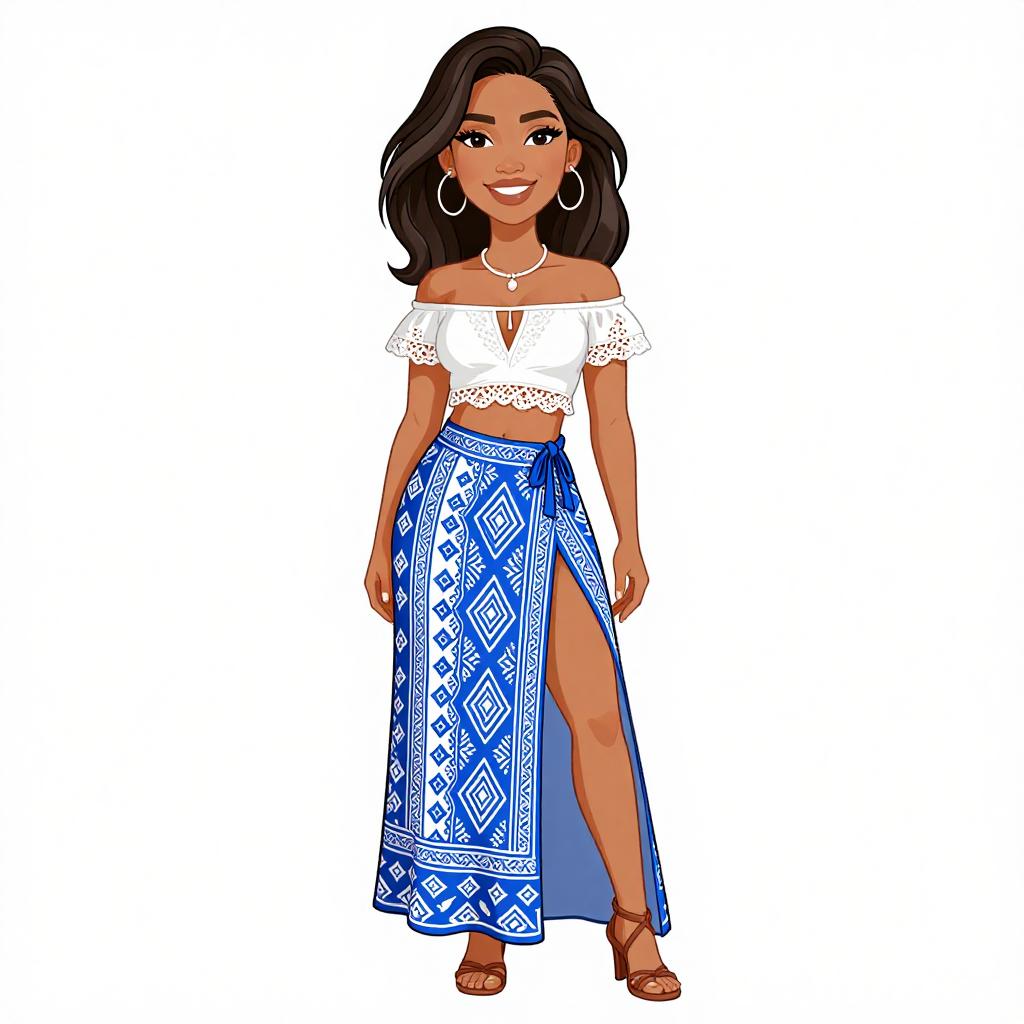 Woman with pretty face and pretty hair. smiling Woman, Bohemian, suede crop top with fringe detailing, scoop neckline, wide-leg pants with colorful ethnic print, fringe oversized clutch in white with stud accents. --sref 1467