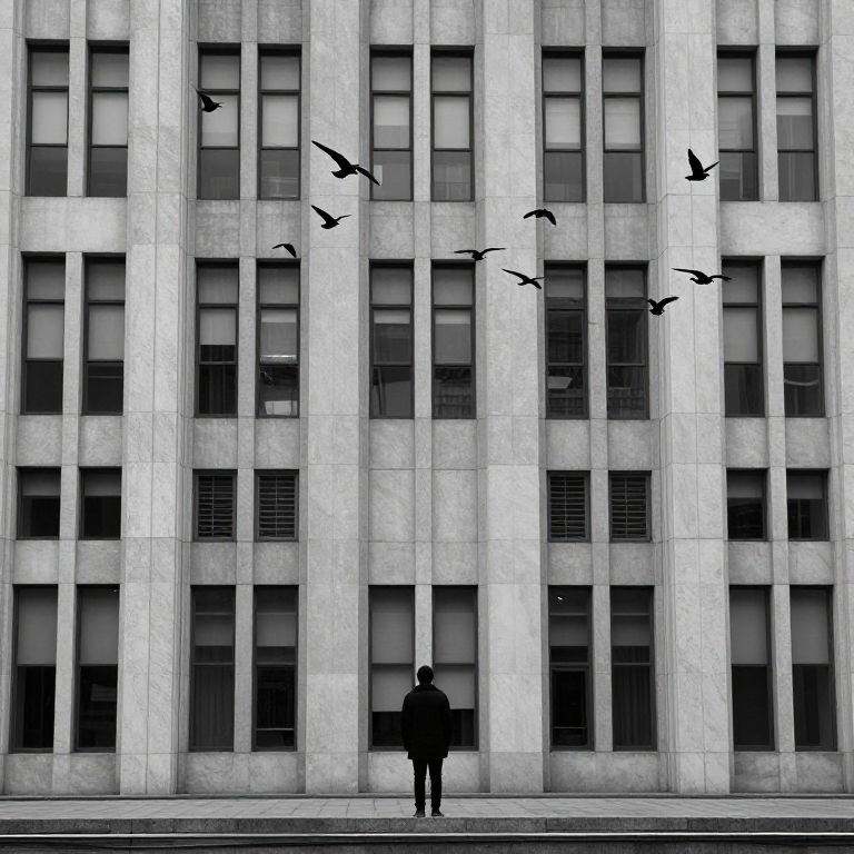 Amidst the structured symmetry of urban architecture, a solitary figure stands transfixed by a soaring flock of birds, embodying the transcendence of freedom and the quiet contemplation of infinite possibilities.