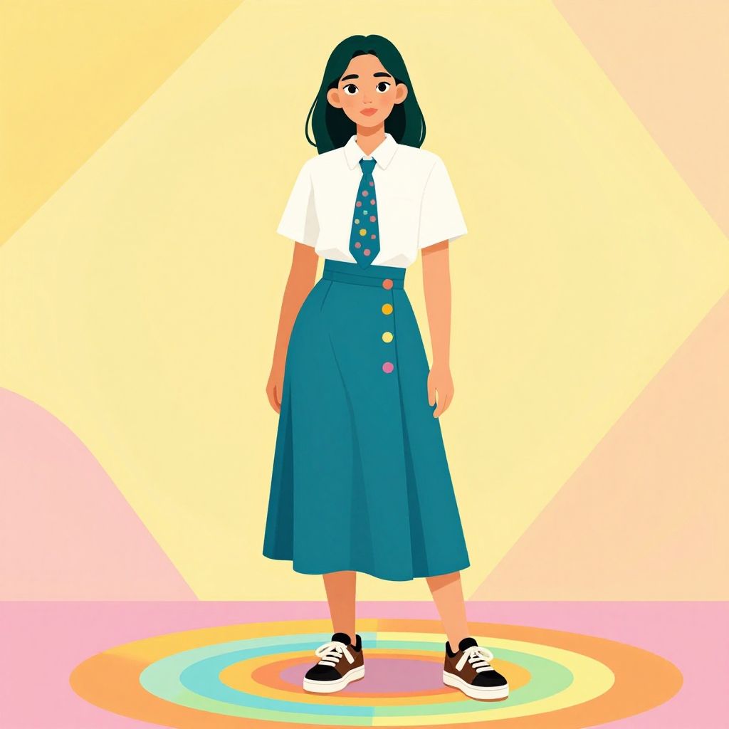 This digital illustration features a young woman with straight, black hair standing against a pastel yellow and pink gradient background. She wears a white short-sleeved blouse, a blue tie with a floral pattern, and a high-waisted, teal skirt with three colorful buttons on the right side. Her black and white sneakers are visible on a multicolored, concentric circle pattern on the floor. She has a light skin tone, rosy cheeks, and a simple, cheerful expression. The overall style is bright, playful, and cartoon-like, with bold colors and clean lines.