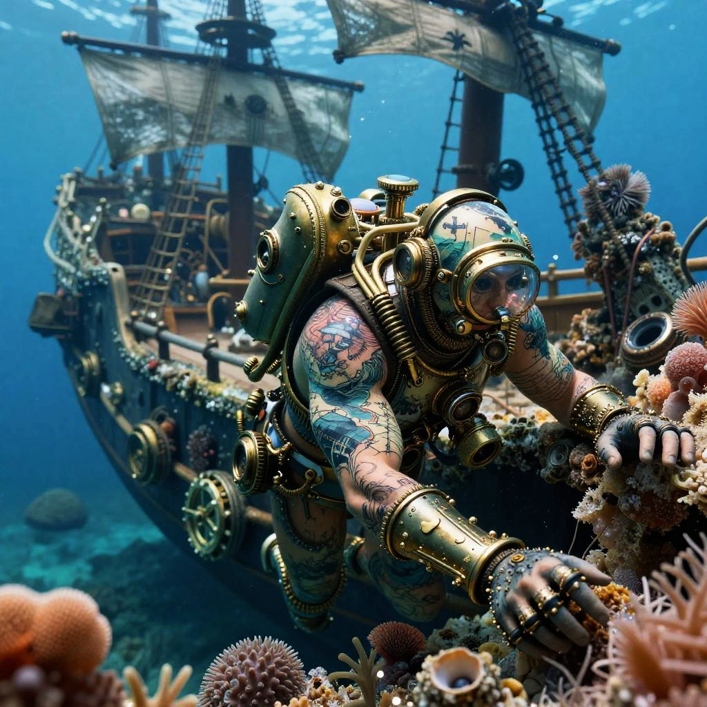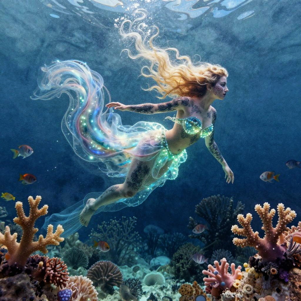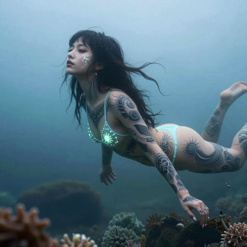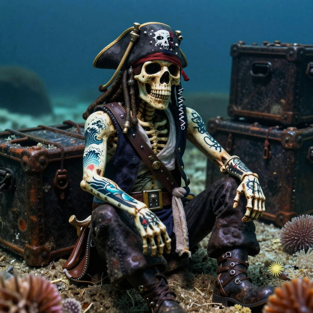 An ancient mermaid skeleton adorned with pearl jewelry, resting among sunken pirate treasures on the ocean floor, dramatic underwater digital art, macro lens capturing fine tattoo details, emphasis on sea-life connection.